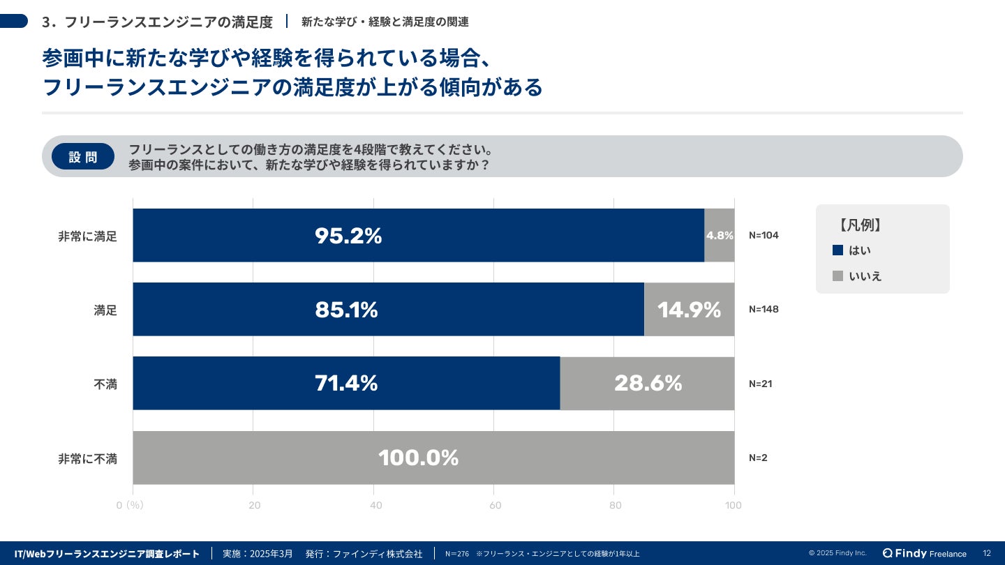 全体の89.3%はフリーランスとしての働き方に満足していると回答。「非常に満足」と回答した人のうち、参画中の案件において新たな学びや経験を得られていると回答した人は95.2%と高い結果になりました。
