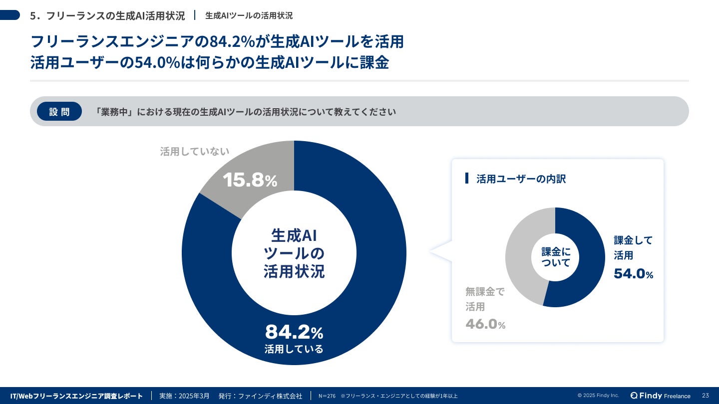 ◆フリーランスエンジニアの84.2%が生成AIツールを活用。その内54.0%は生成AIツールに課金