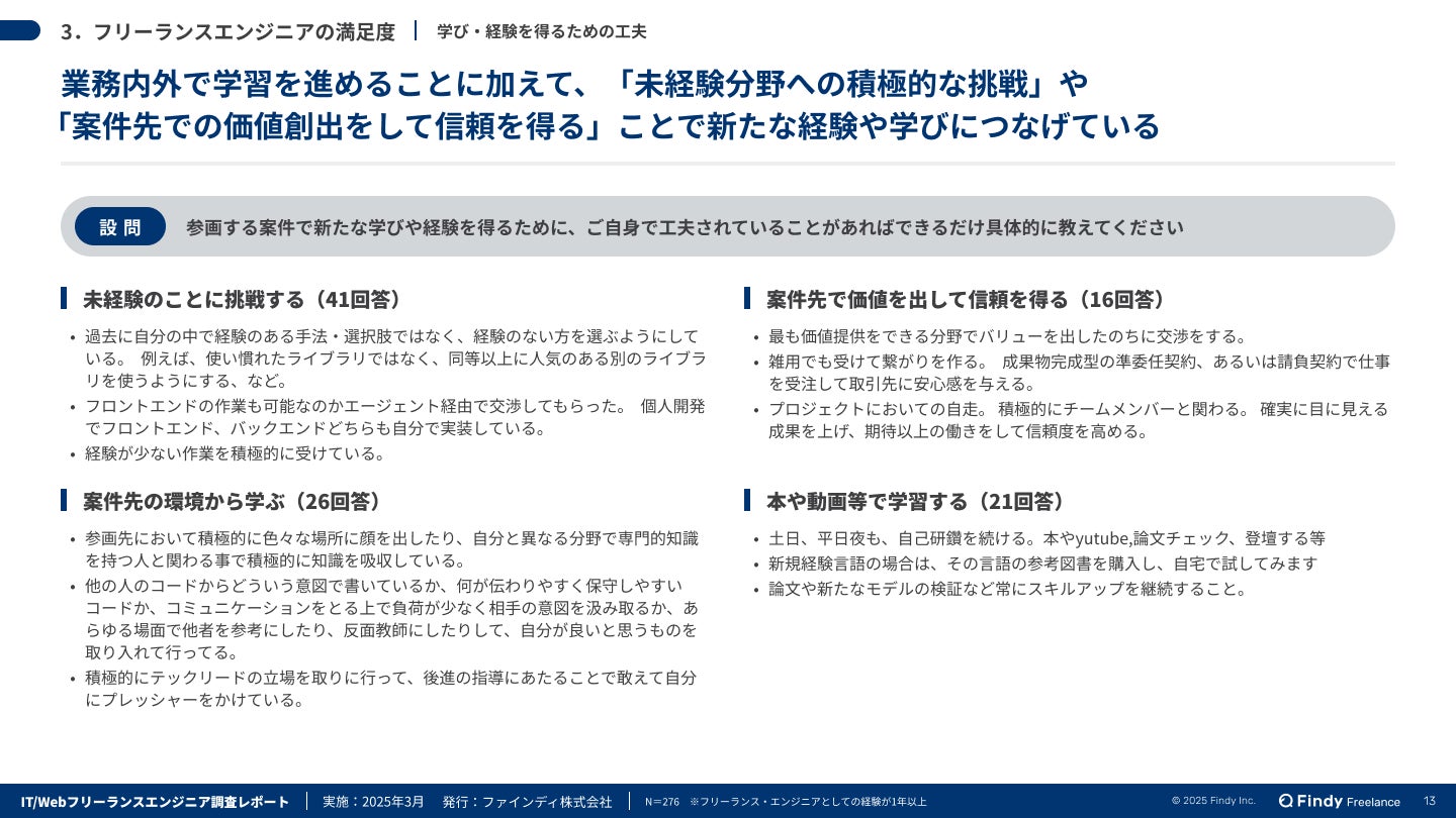 ・新しい学びや経験を得るために、「未経験分野への積極的な挑戦」「案件先での価値創出をして信頼を得る」などの工夫をしている。