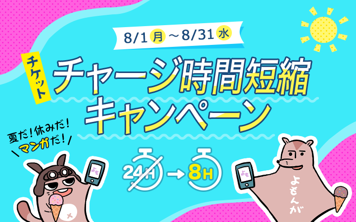 マンガよもんがでは、本日8/1から8/31までの1ヵ月間、夏のお得なチャージ時間短縮キャンペーンを開催いたします。