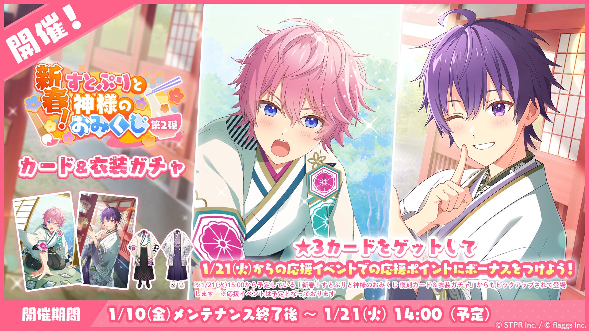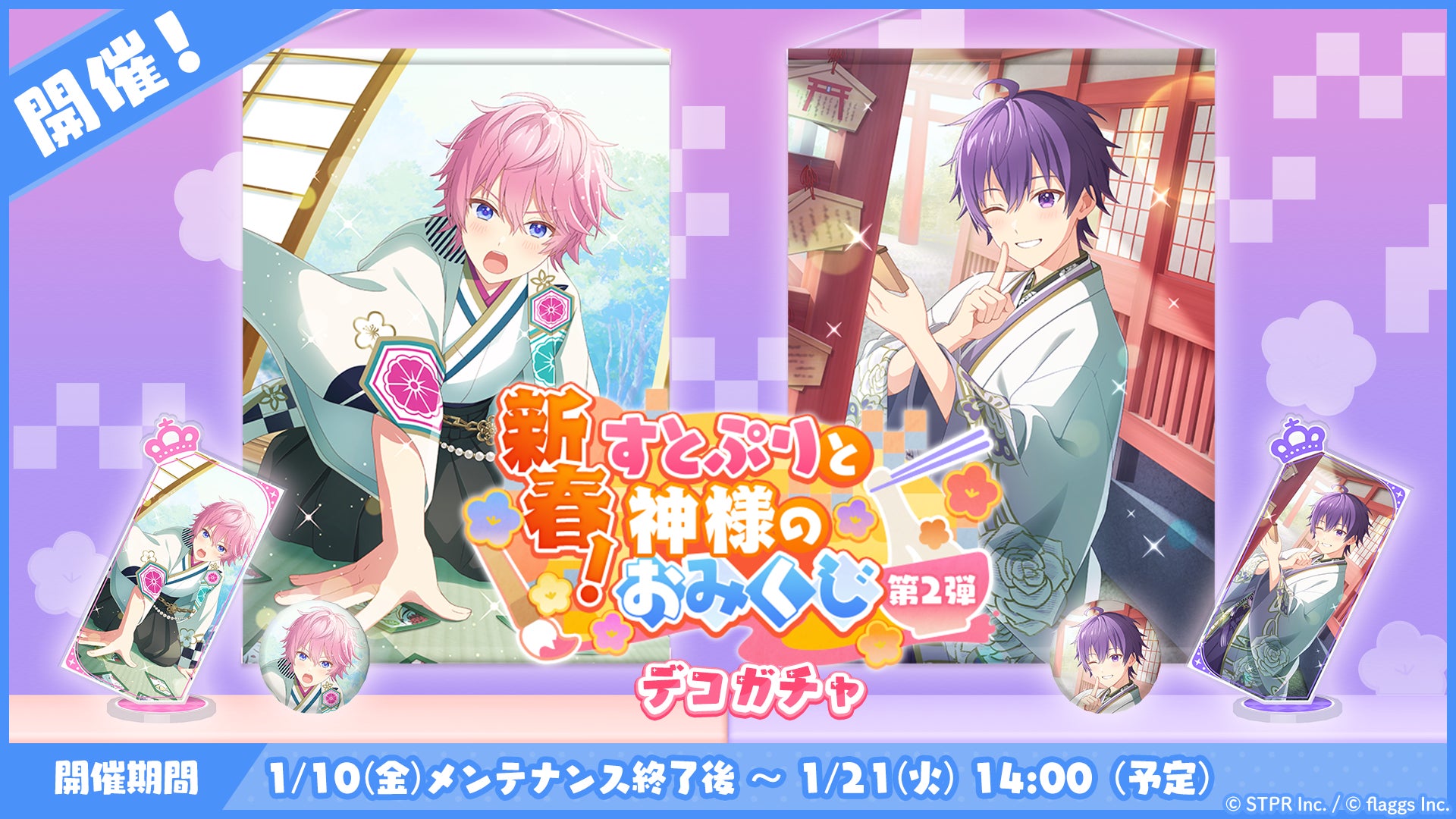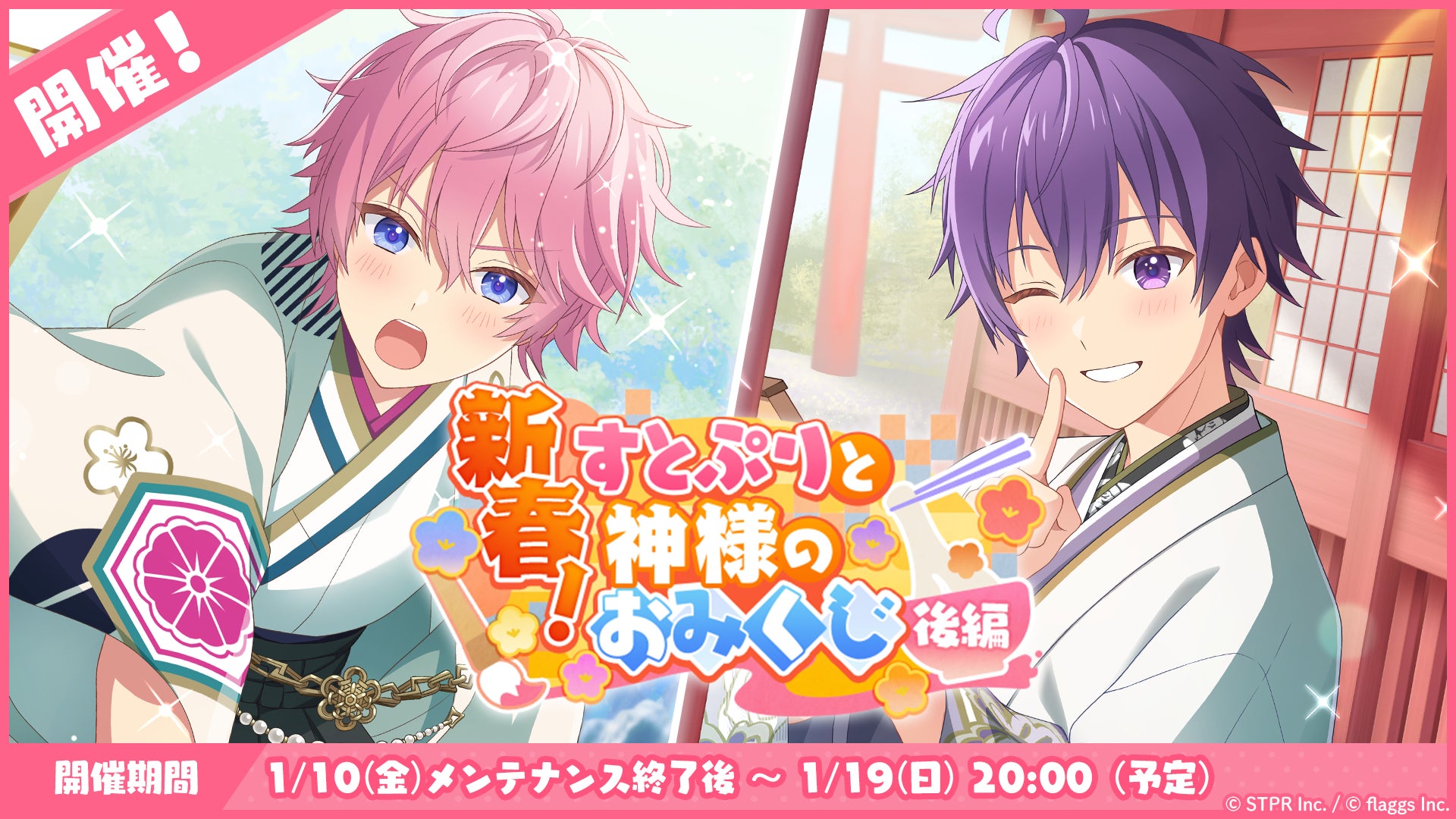 株式会社flaggs(フラッグス)(本社:東京都品川区、代表取締役CEO:吉江 直人)と株式会社STPR(本社:東京都渋谷区、代表取締役:柏原 真人、以下STPR)とは、本日1月10日(金)に2.5次元アイドルグループ「すとぷり」の公式ゲームアプリ「すとぷりWith!!(通称:すとうぃず)」のゲーム内イベント「新春!すとぷりと神様のおみくじ 後編」の開催についてお知らせいたします。