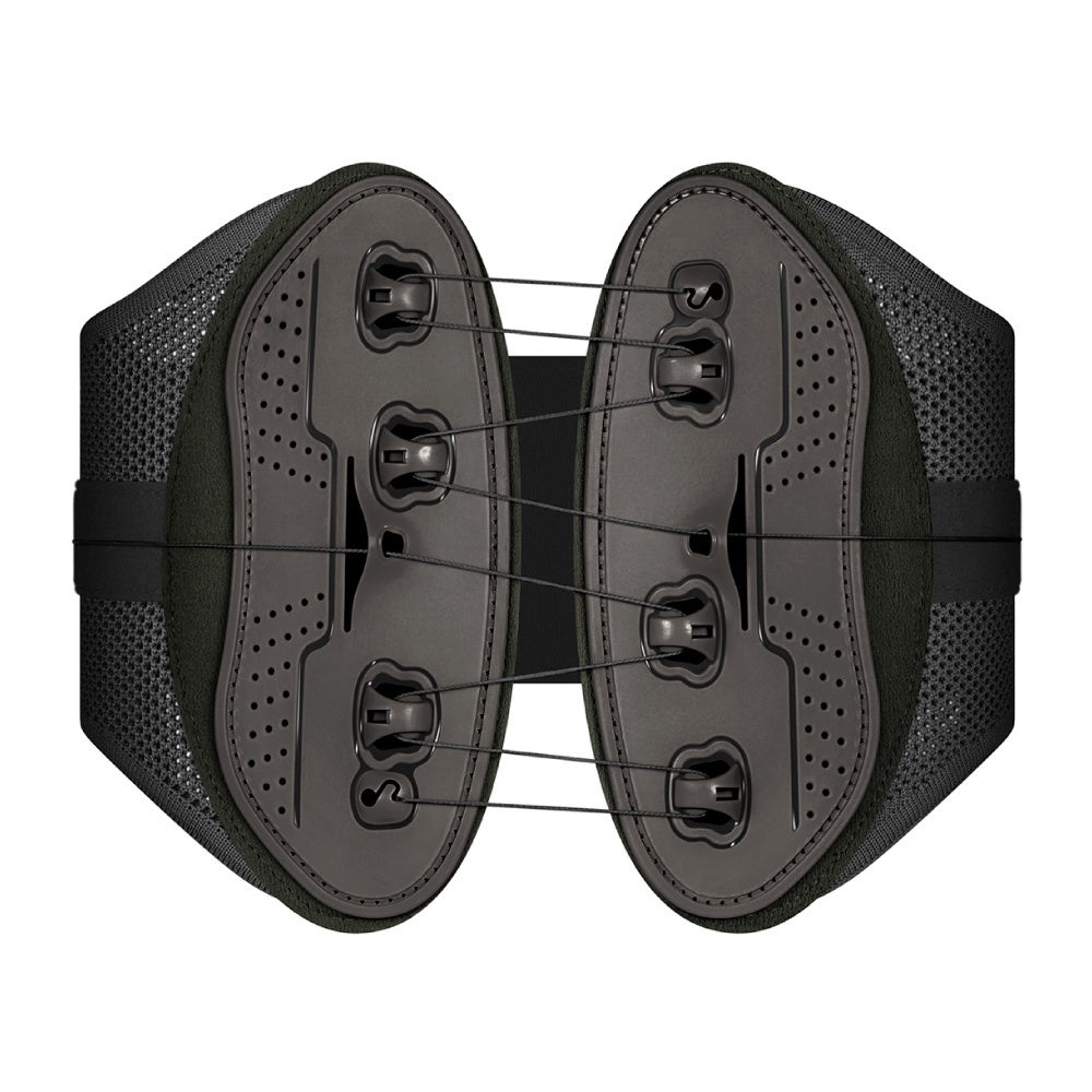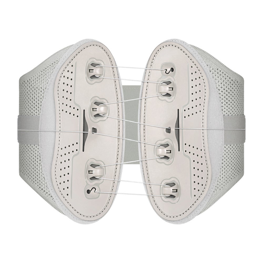 腰の形に合わせてフィットするように、ストラップが上下2段に分かれているWストリング構造。その時の状態に合わせて、両手でストリングを引っ張るだけで締め具合を自在に調整することができます。
