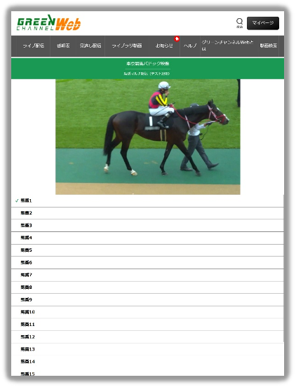 グリーンチャンネルWebのマルチ会員 ※マルチ会員のお客様は無料で視聴できます。 ※各デバイスに表示される【東京競馬パドック映像馬別マルチ配信(テスト運用)】もしくは【東京競馬パドック映像】のボタンを選択することで視聴できます。 |