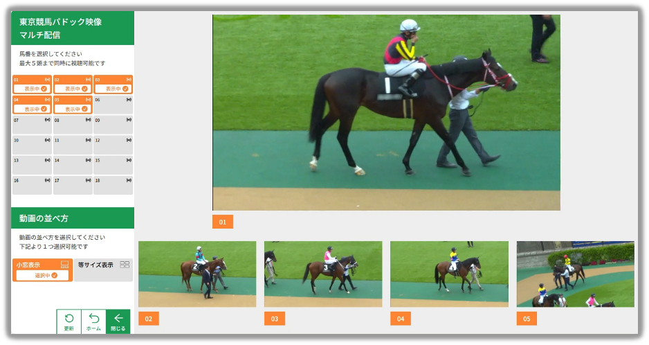 テレビ(アプリ)・パソコン(ブラウザ)・スマートフォン(ブラウザ)・タブレット(ブラウザ) ※FireTVの場合は最大4頭、パソコン(ブラウザ)の場合は最大5頭のパドック映像を同時視聴が可能です。 |