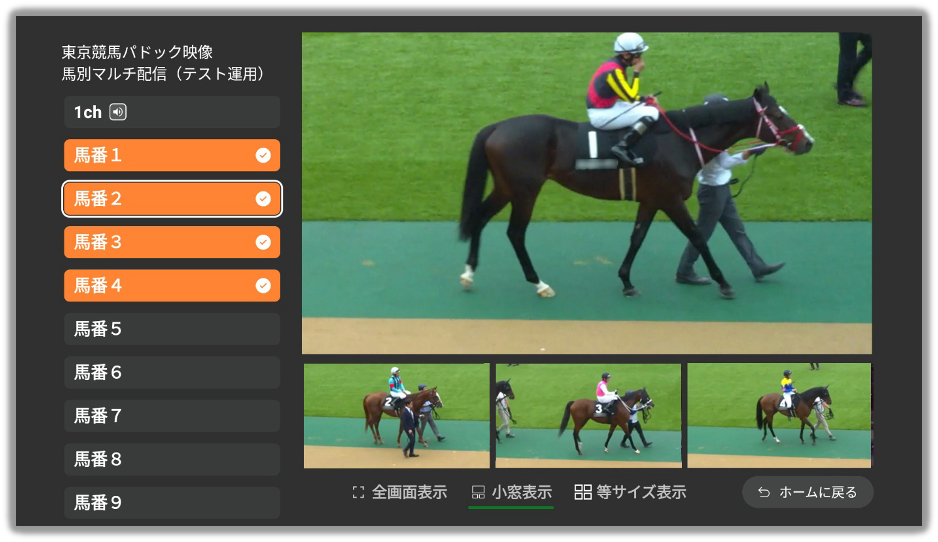 東京競馬全レースの馬別パドック映像を自動でリアルタイム配信 ※パドックに馬が入場後、馬別のパドック映像をリアルタイムで配信します。 ※テスト運用中のためレース番号、馬名の表示はありません。 ※AI技術による自動配信のため、正しい映像が配信できない場合があります。 |