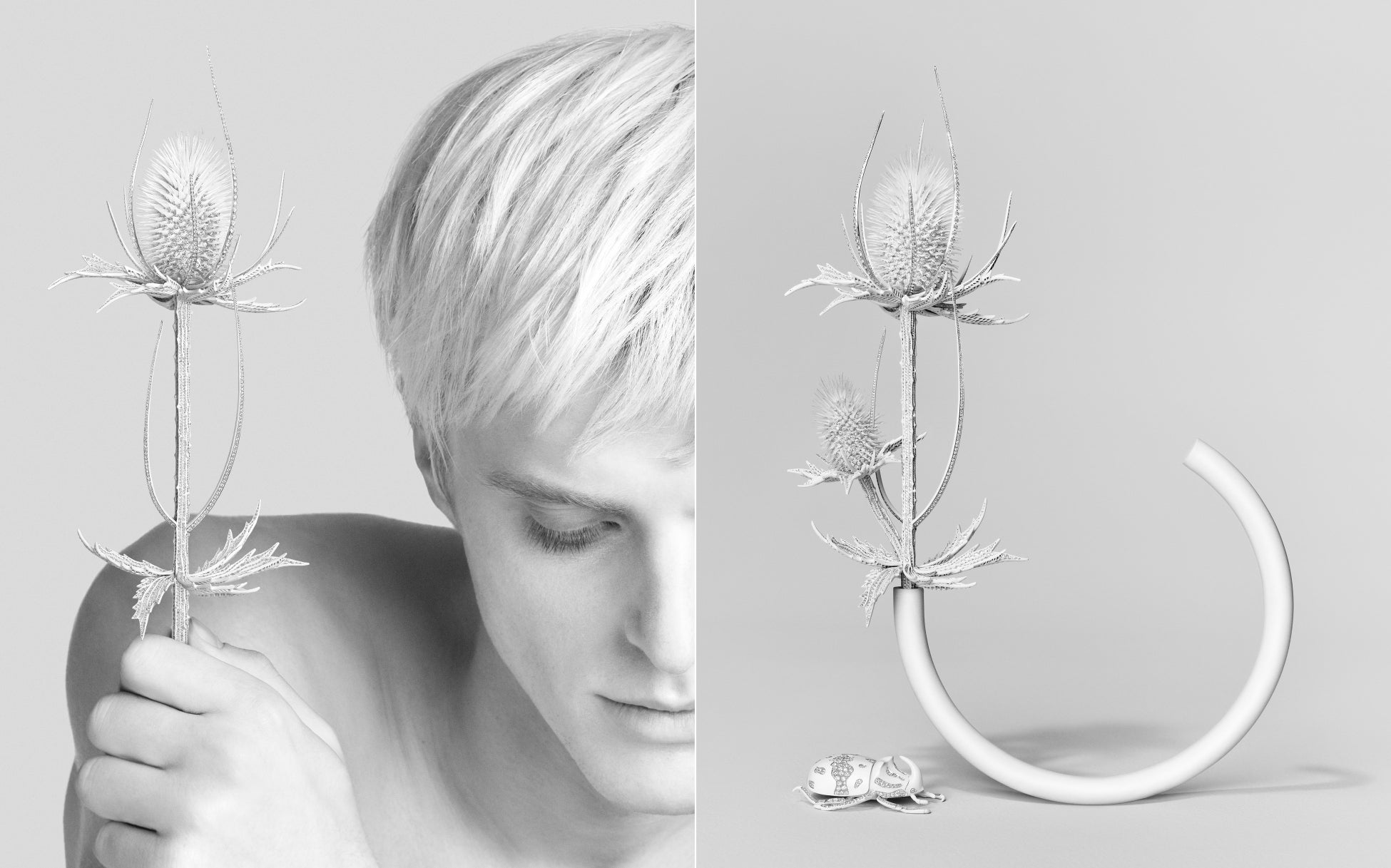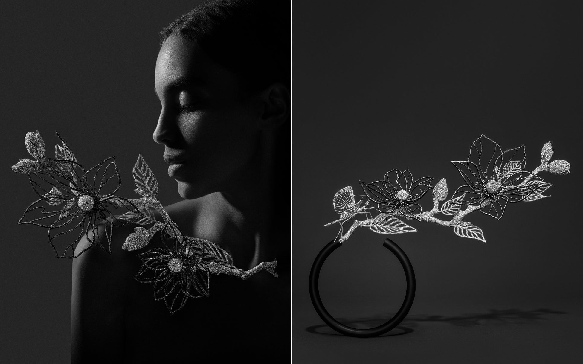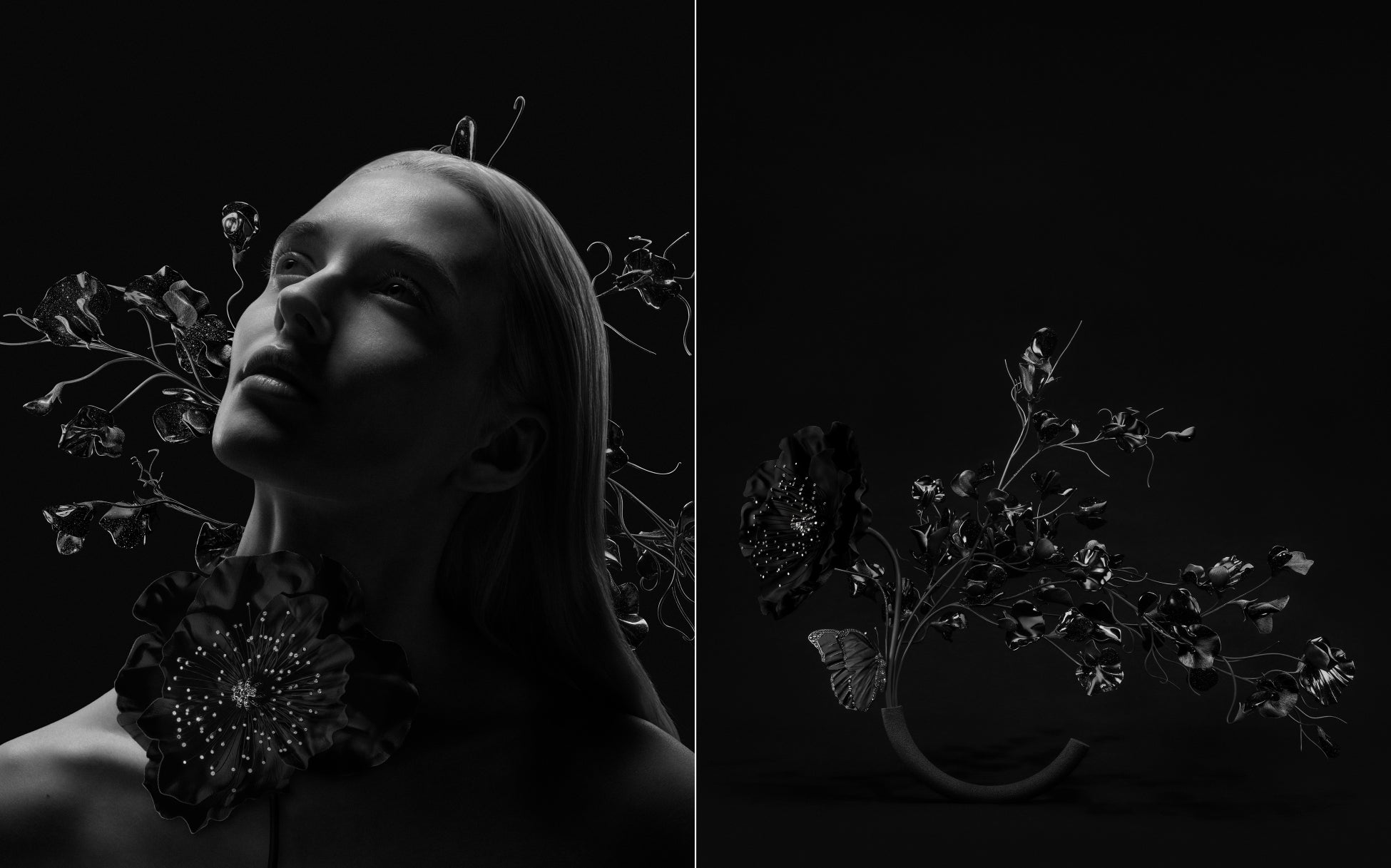 この新作の着想源となったのは、日本の文化、華道の「生け花(いけばな)」と「侘び寂び(わびさび)」の思想でした。植物と昆虫から成る6つのコンポジション作品で構成されたコレクションは、「光」を軸として、流転する生命の一瞬を捉えています。