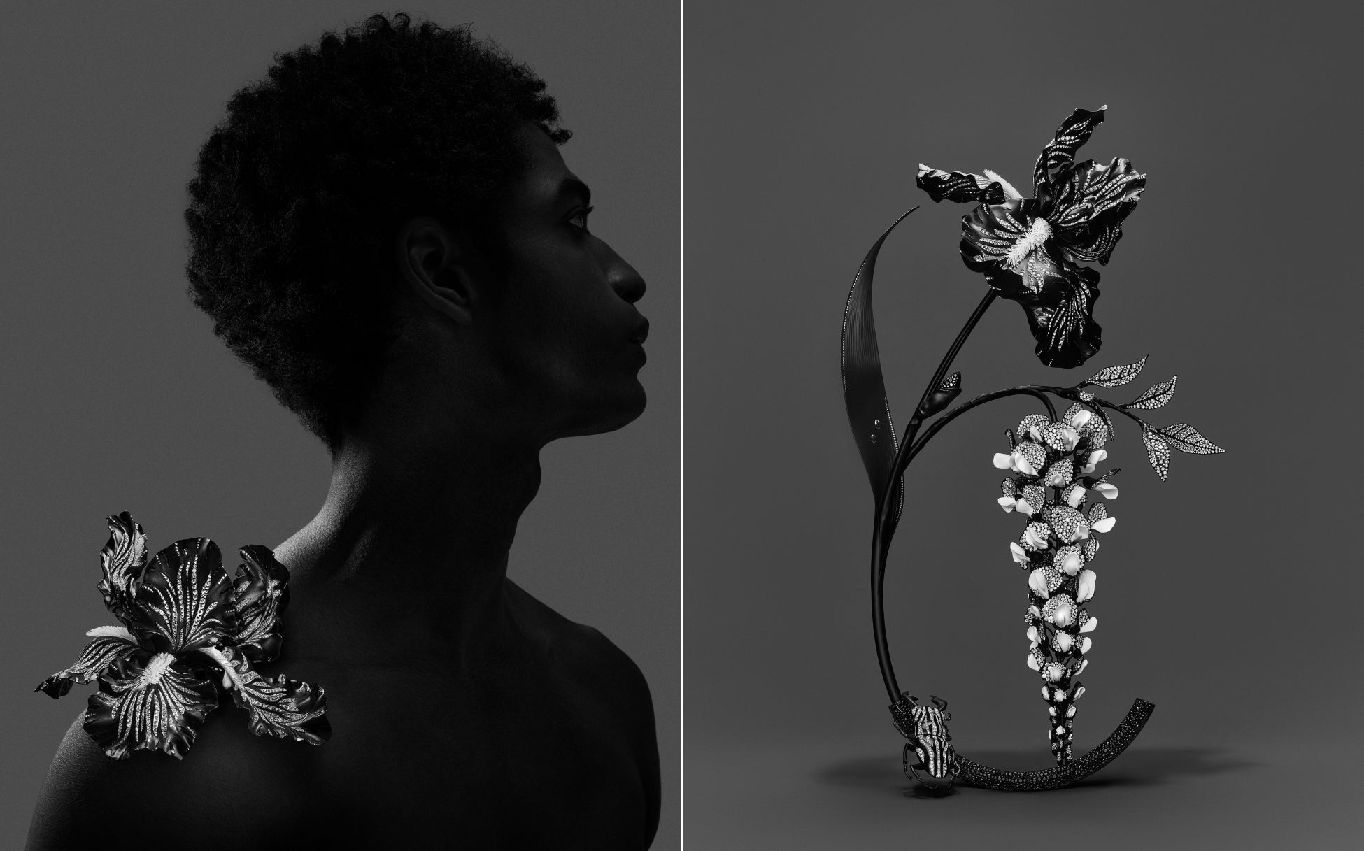 コレクションのはじまりである、コンポジション No.6は最も明るく、軽やかな光を宿します。やがて光が徐々に翳りを帯びていき、最後のコンポジション No.1では深い暗闇の世界を描き出します。この光の変遷は、誕生から終焉へ向かいゆく自然の循環を象徴し、守るべき自然の儚さを私たちに思い起こさせます。延べ18,000時間以上に及ぶアトリエの緻密な制作を経て創り上げられた、6つのコンポジション作品は、身に纏うアートピースという側面を持つ、類まれな22点のハイジュエリー作品で構成されています。常に自由な創造性を追求する「カルト ブランシュ」コレクションにおいて、本作もまた、造形・素材・技法といったあらゆる側面において、ハイジュエリーの限界を超える挑戦と可能性を押し広げる革新を続けています。