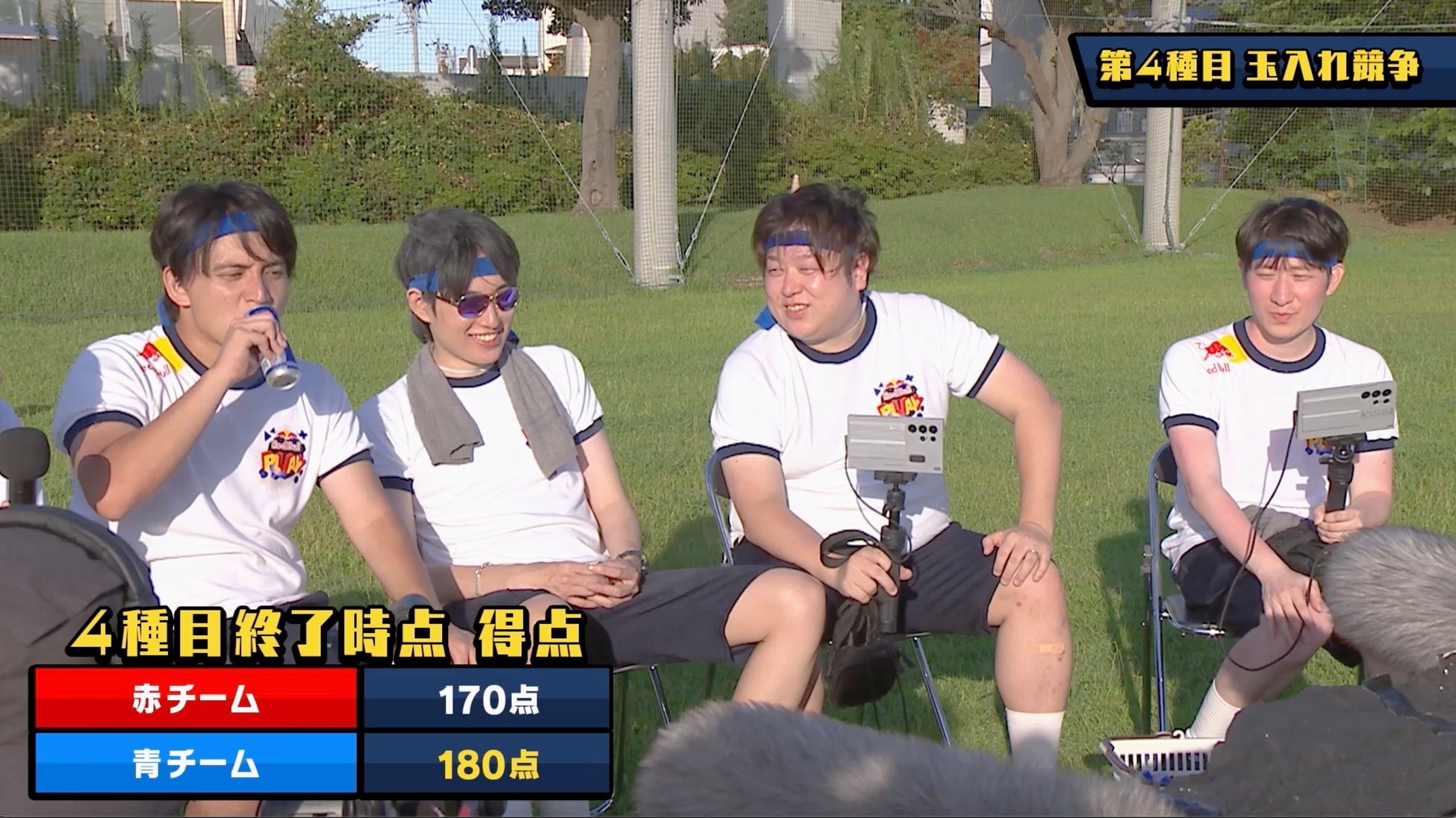 体操着に着替えた配信者たちは、けんき、らいじん、しゃるる、KHの青チームと