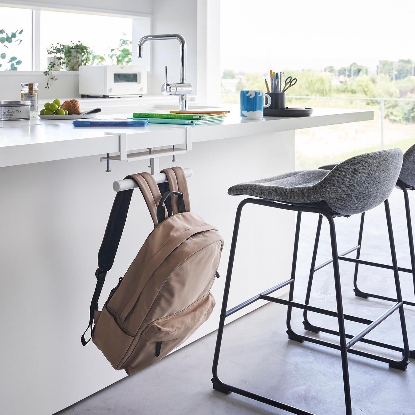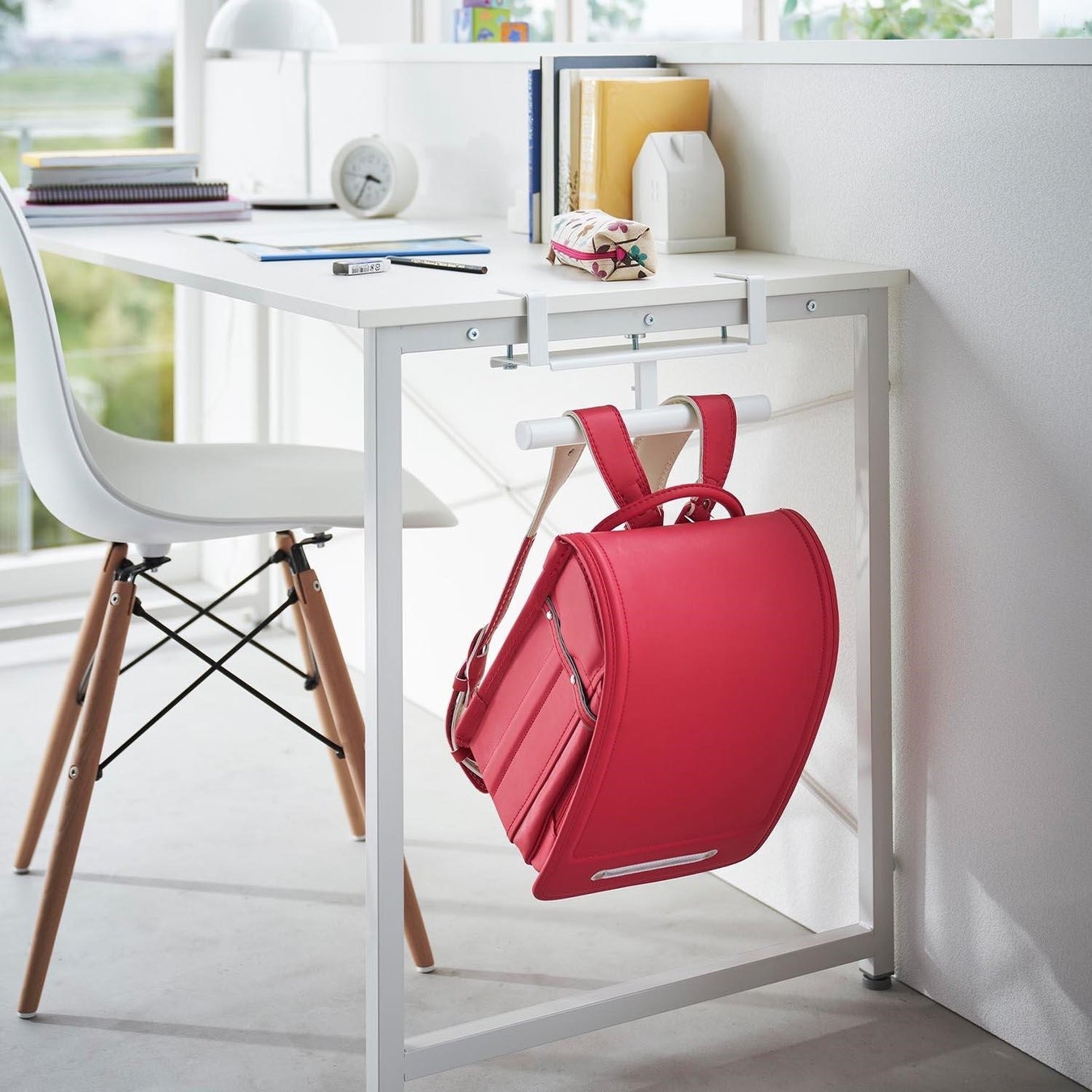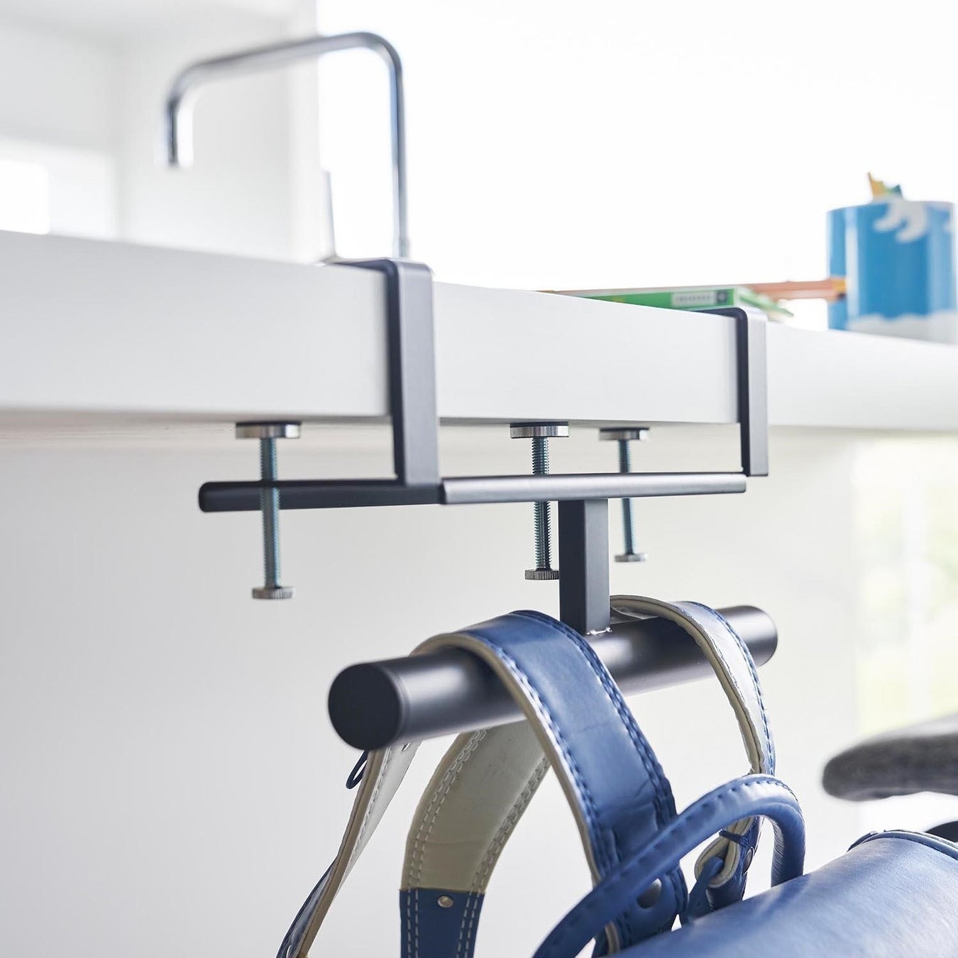 デスクやキッチンカウンターの天板に調節ネジでしっかりと取り付けできる便利なランドセル・リュック収納ハンガー。