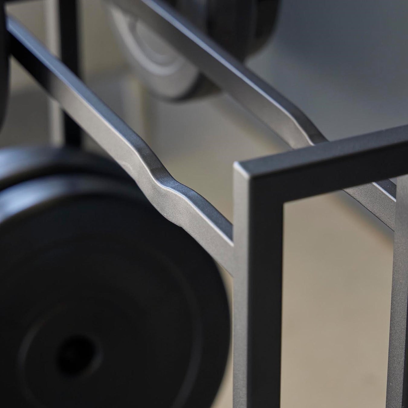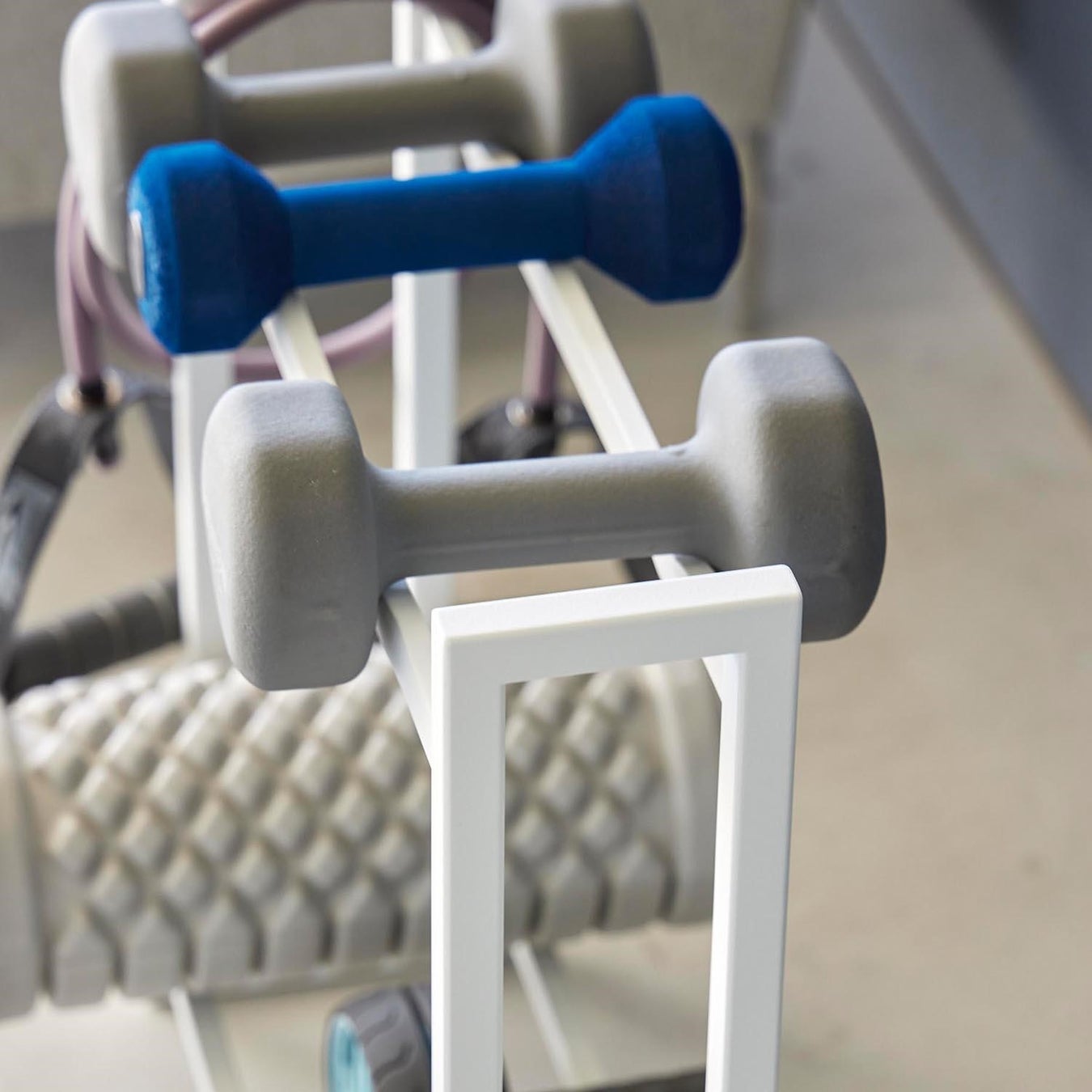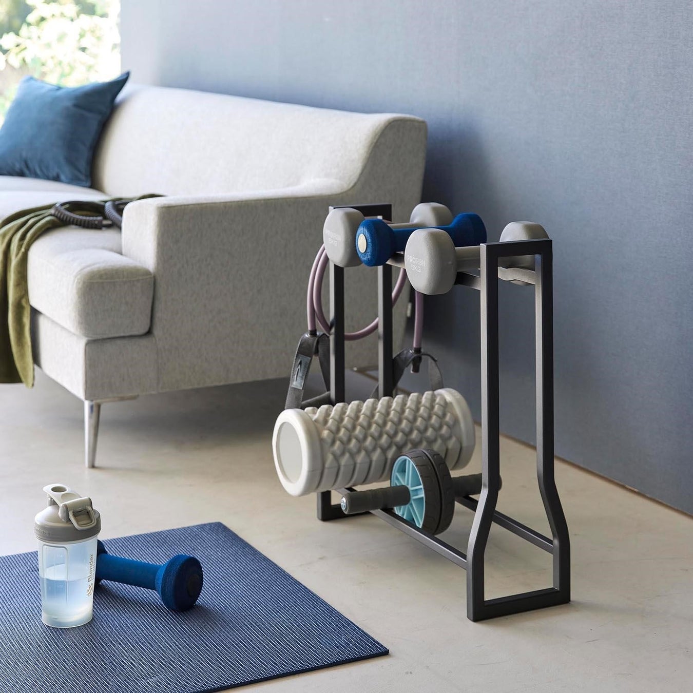 重量可変プレートや腹筋ローラーなどのフィットネスグッズも一括収納できて便利。