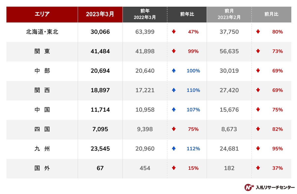 2023年3月のエリア別公示案件数は、エリアにより前年より増加・減少の傾向が分かれました。