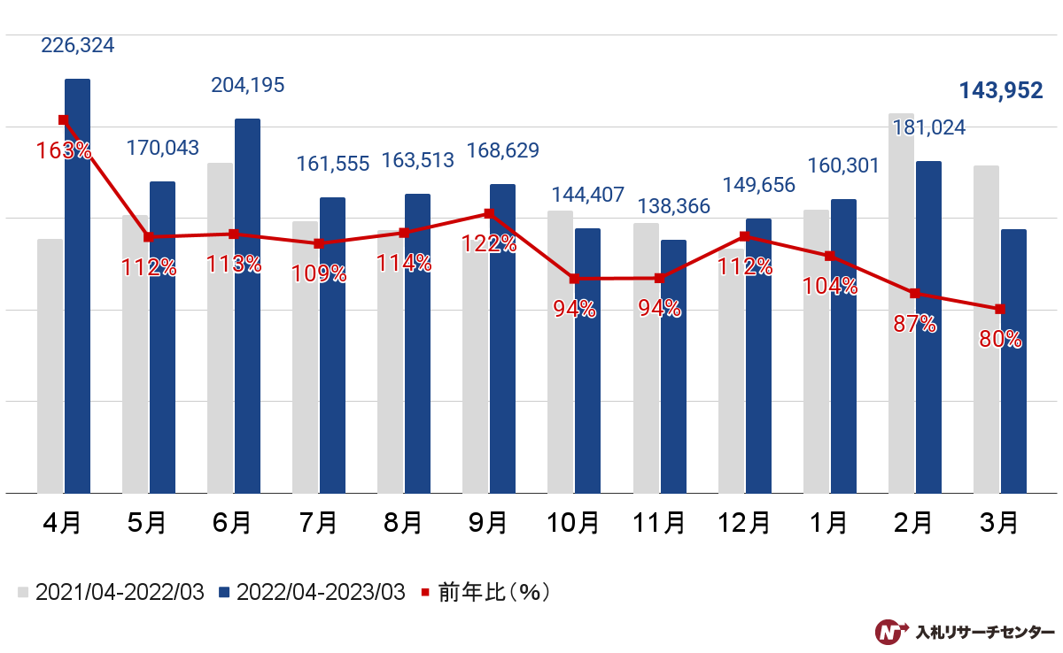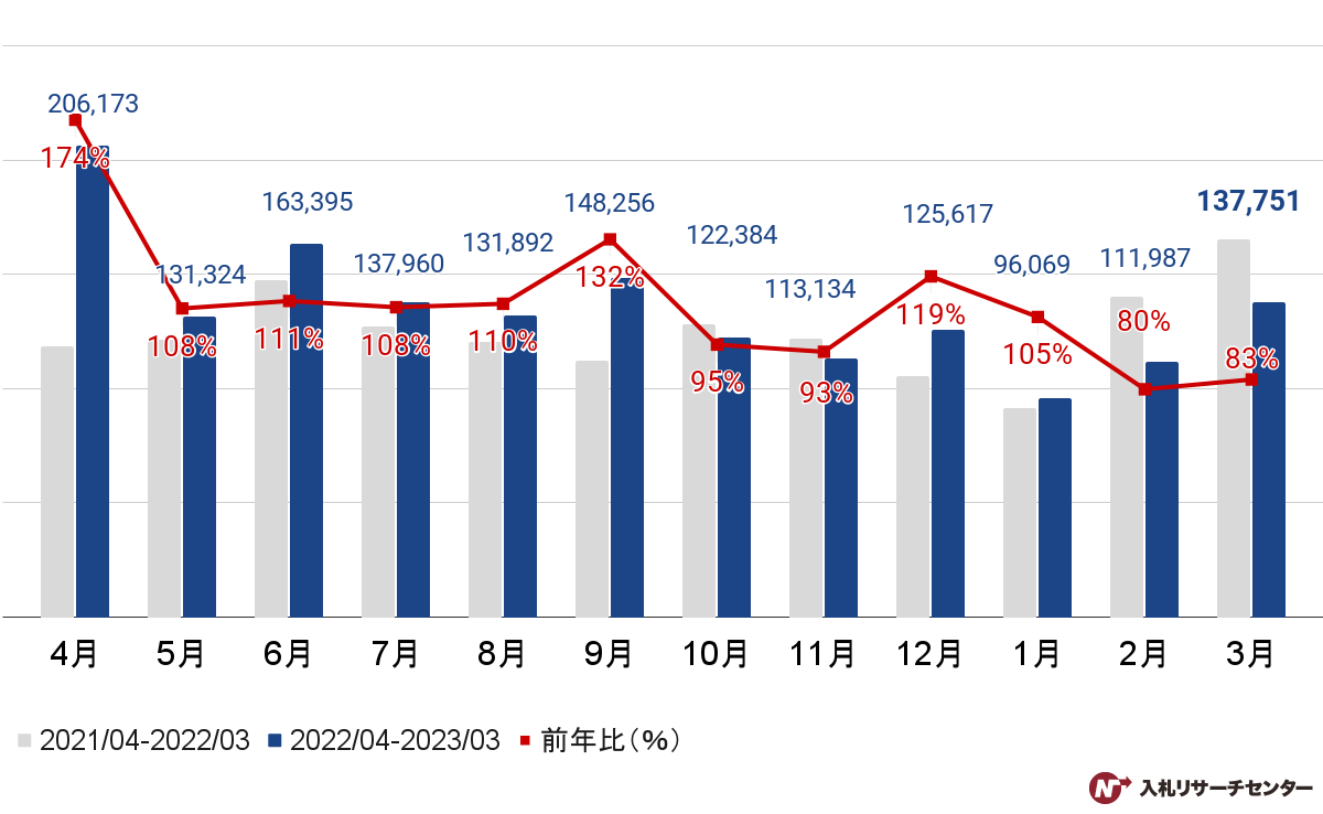 2023年3月の落札案件数の総計は137,751件で、前年比83%となりました。