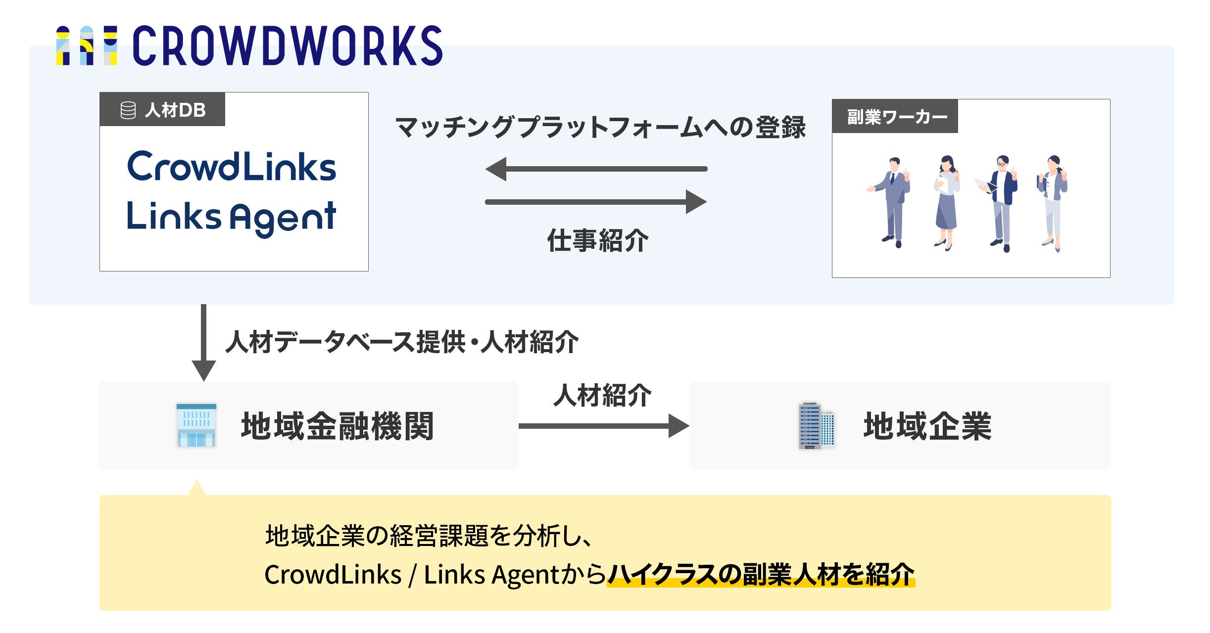 その地域金融機関をバックアップすべく、“先導的人材マッチング”支援サービスとして、10万人を超えるハイクラスな副業ワーカーを有する「クラウドリンクス」のデータベースの提供を開始します。課題を解決できる高度な専門スキルを持つ副業ワーカーの提案から、ワーカーと地域企業との契約までクラウドリンクスが伴走することで、地域金融機関の人材マッチングのパートナーとして地域経済の活性化に貢献してまいります。地域企業への人材紹介に課題を持っていらっしゃる地域金融機関の皆様は是非、クラウドリンクスのご活用をご検討ください。