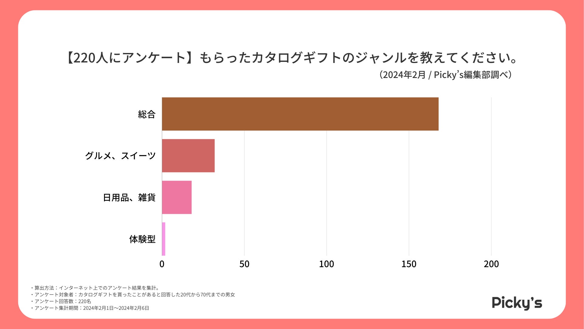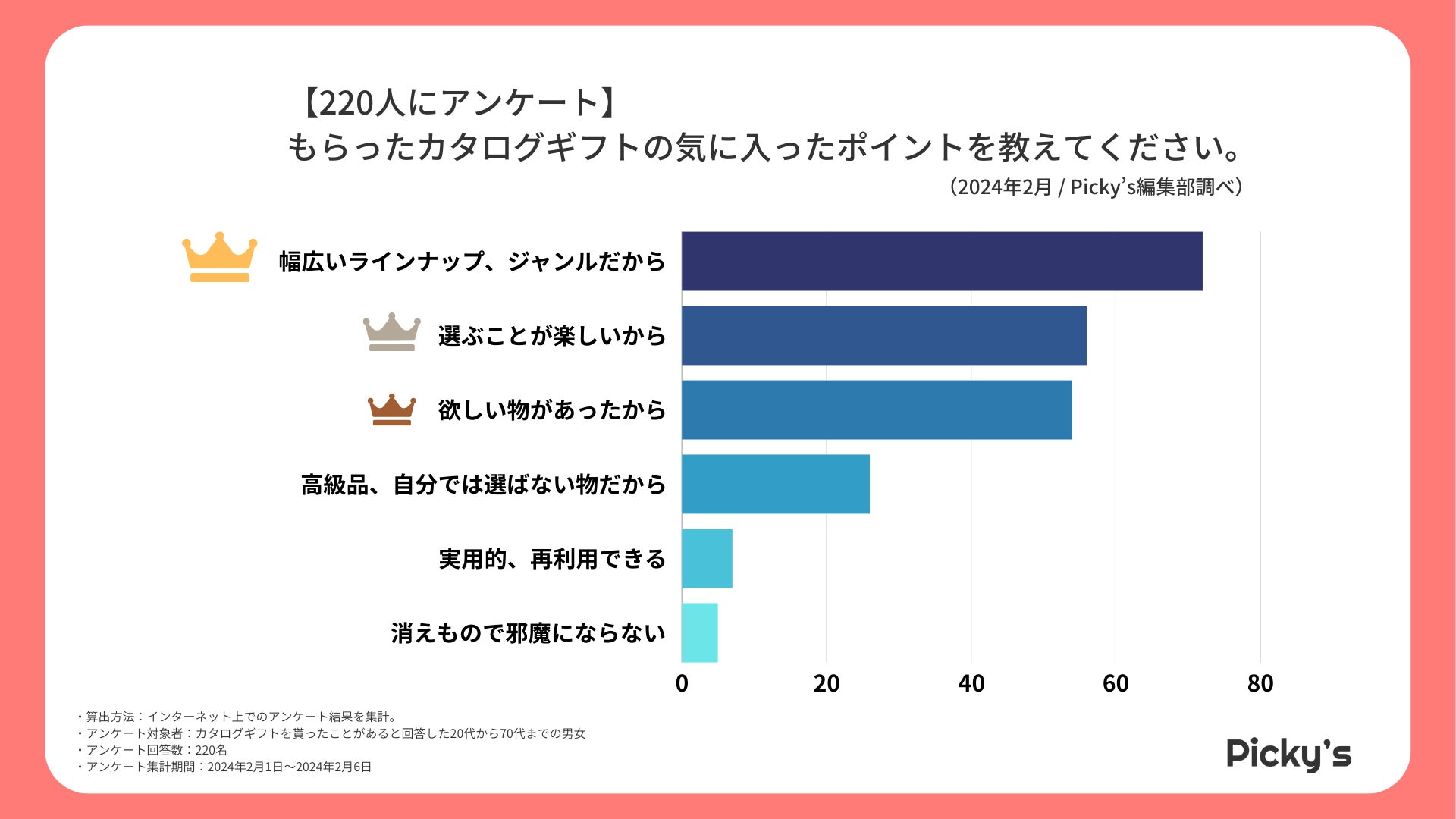 「Picky’s」は、インターネットショッピングにおいて、購入前に試せない・選ぶべきものがわからないという課題の解決を目標に、あらゆる商品のおすすめランキングや検証レビューを紹介するサイトです。このたびPicky’s(https://rentry.jp/)では、カタログギフトについてインターネット上でアンケート調査を行いましたので発表いたします。
