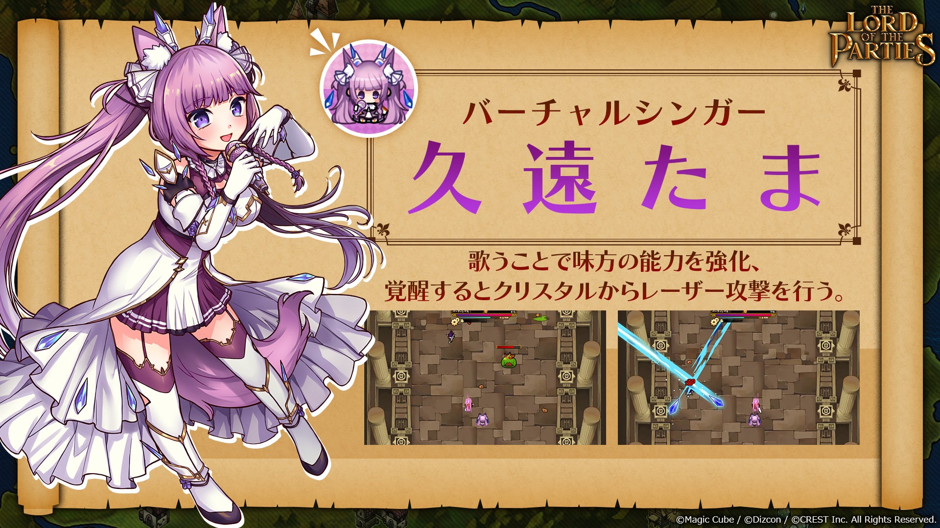 株式会社CREST(本社:東京都新宿区、代表:三上政高/梁 俊模、以下「CREST」)は、Magic Cube/Dizcon制作の新作アクションRPGゲーム『The Lord of the Parties』(6月30日発売、価格:1,640円)において、バーチャルシンガー「久遠たま」(GuildCQ所属)のDLCを7月28日(木)から配信することを決定いたしました。