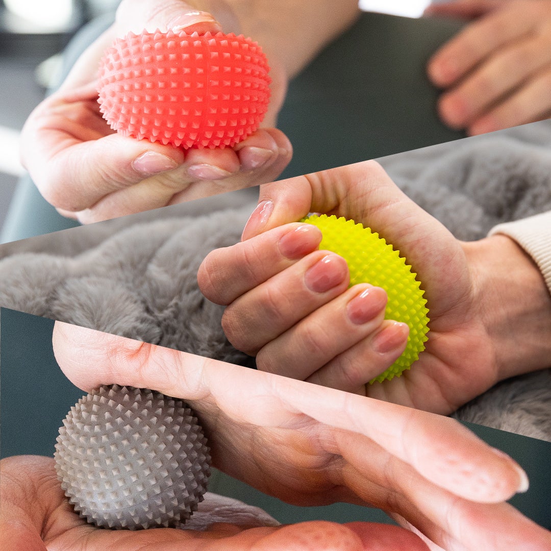 異なる3種類のボールは、握力の強化、指先の感覚の強化、手の筋膜リリースを目的としています。手と指の筋肉のリハビリや強化におすすめのキットです。