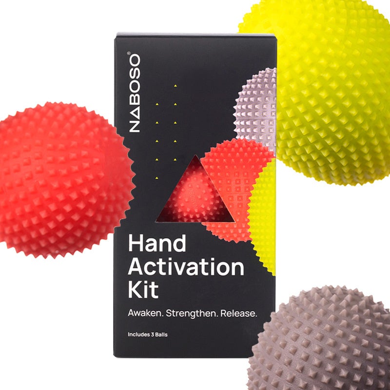 「ナボソ ハンドアクティベーションキット」は、手と指の感覚を刺激、筋肉のリリースや強化に最適なアイテム。米国特許取得済み(米国特許第11642279号)のナボソ独自のテクスチャーで覆われた、人間工学に基づいてデザインされた3種類のボールがひとつのキットになっています。