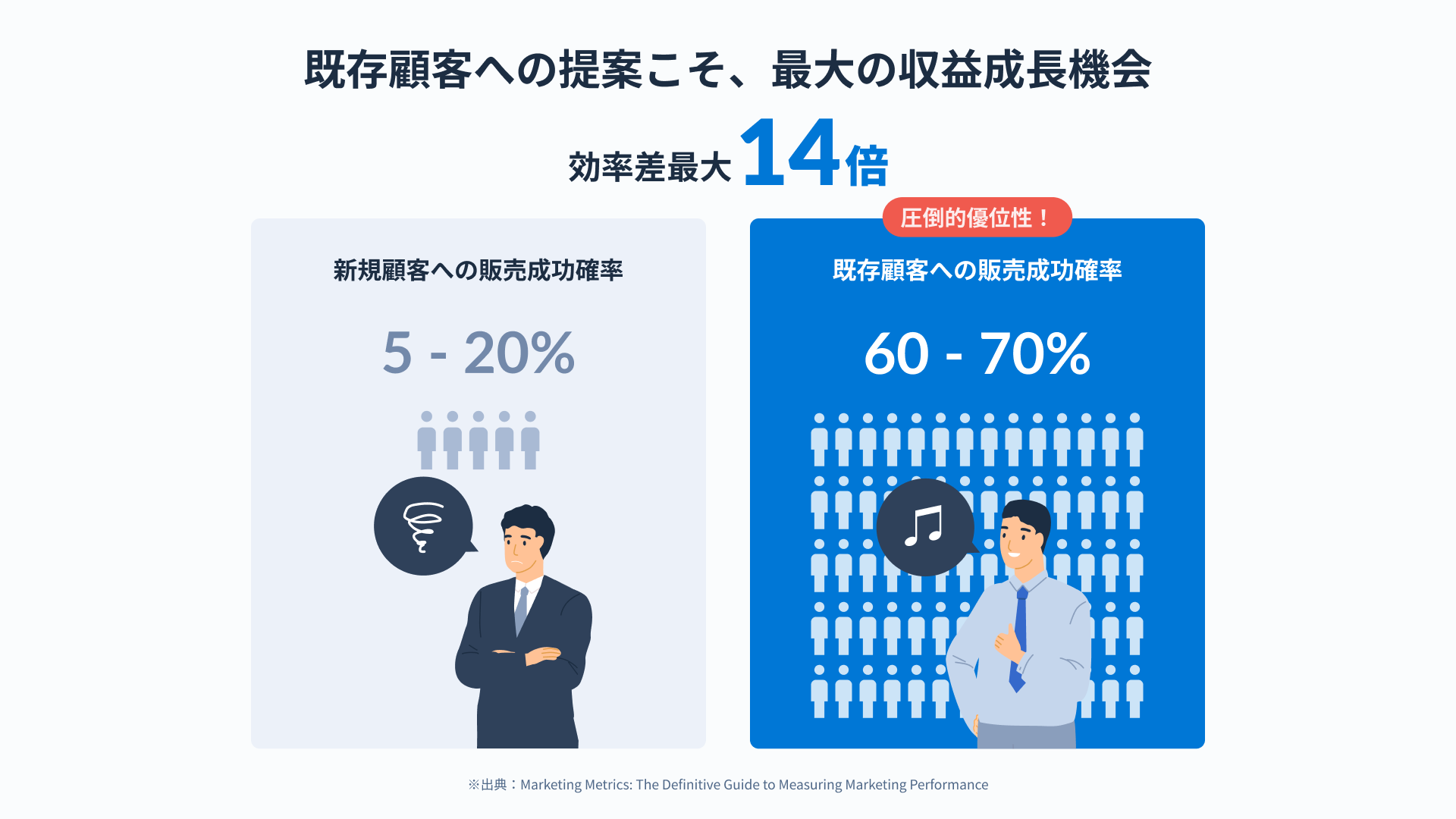 日本企業の多くが、人口減・既存事業の縮小・事業承継といった構造的な課題に直面しています。新規開拓にはコストも時間もかかる一方、既存顧客への販売成功率は新規見込み客の最大約14倍(※)。「既存顧客という資産を、もっと収益につなげたい」というニーズが高まっています。