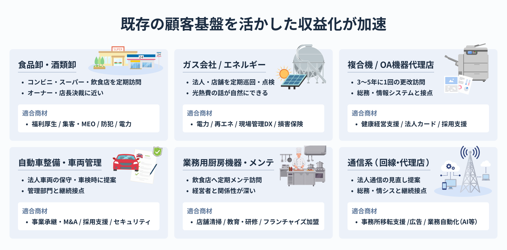 仕入れ交渉も直接契約も不要で提案できる商材が広がる仕組みとして、特に顧客基盤を持つ企業の参画が加速しています。