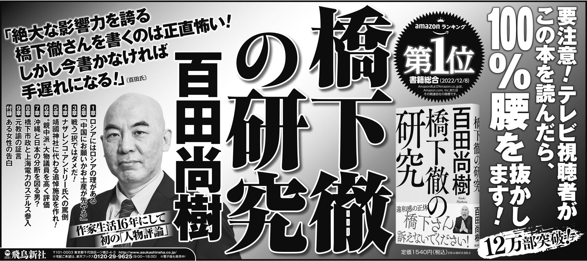 12月15日に発売した作家・百田尚樹氏の最新刊『橋下徹の研究』(飛鳥新社刊)がたちまち12万部突破!橋下氏の膨大な言動を徹底検証。その衝撃がネット上で話題に!