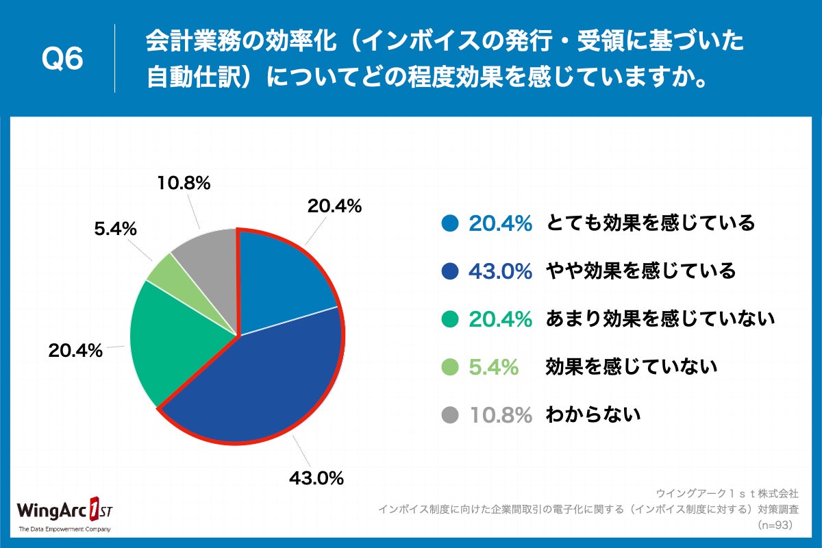 Q2で「すでに対応済み」と回答した方に、Peppolの導入後の後続業務について、「Q6.会計業務の効率化(インボイスの発行・受領に基づいた自動仕訳)についてどの程度効果を感じていますか。」(n=93)と質問したところ、「とても効果を感じている」が20.4%、「やや効果を感じている」が43.0%という回答となりました。