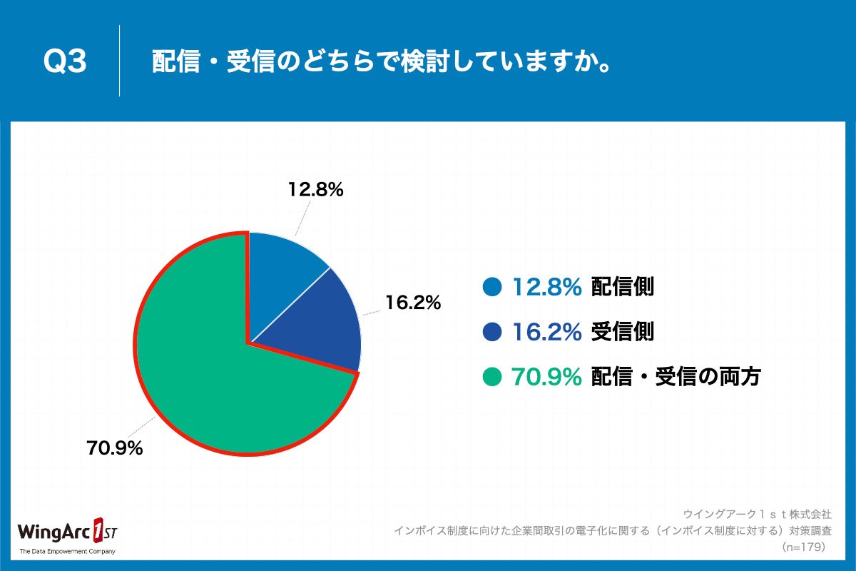 Q2で「すでに対応済み」、「対応する予定である」と回答した方に、「Q3.配信・受信のどちらで対応済み、または検討していますか。」(n=179)と質問したところ、「配信・受信の両方」が70.9%という回答となり、前回調査実施時(2023年8月)の61.7%から+9.2ptとなりました。