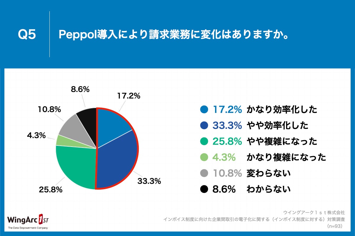 Q2で「すでに対応済み」と回答した方に、「Q5.Peppol導入により請求業務に変化はありますか。」(n=93)と質問したところ、「かなり効率化した」が17.2%、「やや効率化した」が33.3%という回答となりました。
