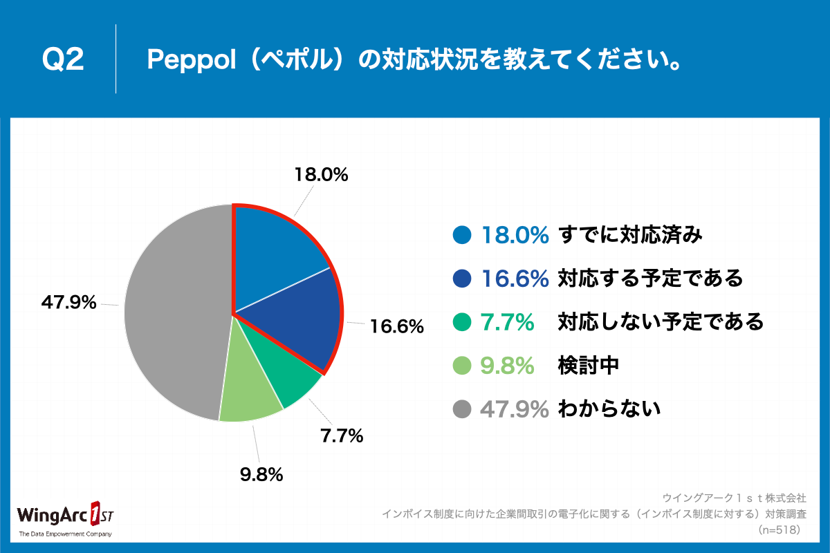 2.Peppol(ペポル)を用いた商取引、18.0%が「対応済」、16.6%が「対応予定」。対応予定以上は前回から+11.2pt伸長。