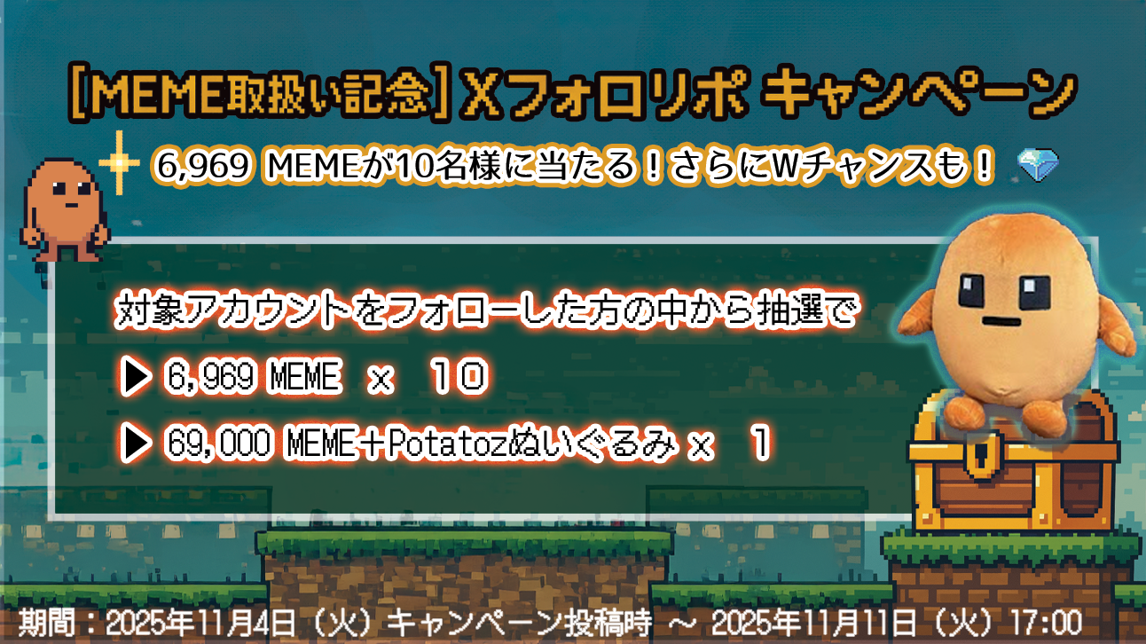 また、2025年11月4日時点で、ミームコイン(MEME)の取扱いは国内初となります(自社調べ)。