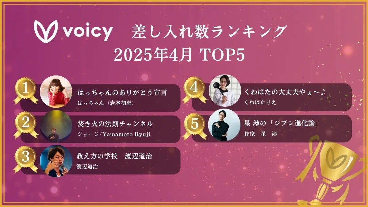 Voicyでは多くの著名な皆様が配信される中での「差し入れ数」7ヵ月連続1位獲得は、はっちゃんの発信内容に対する多くのリスナー様からのサポートの証です。