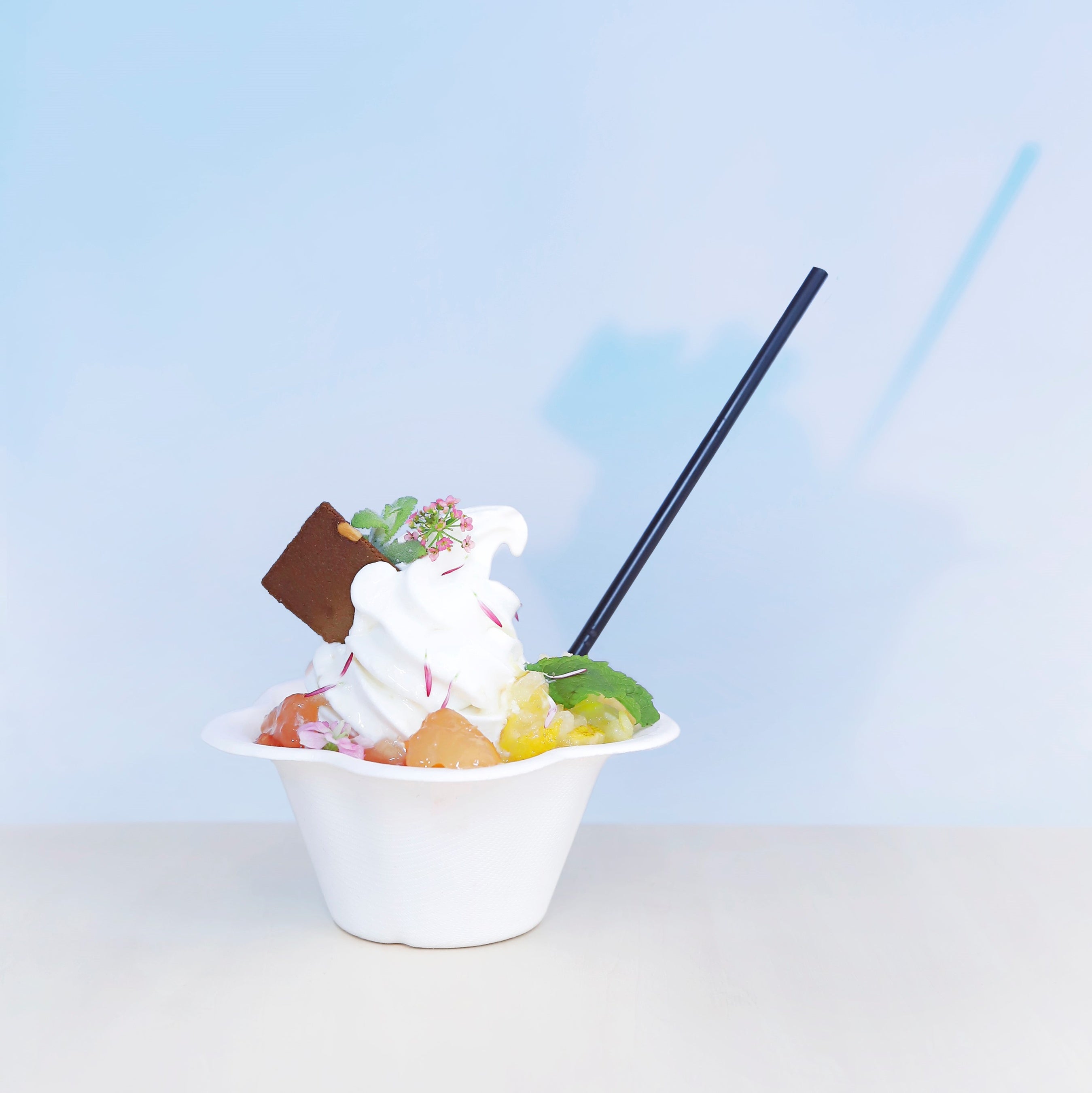 桃・柑橘・京いちごの3種の自家製かき氷ソースは規格外や傷ついて販売ができない果実をまるごと使い、果実味感じる自家製ソースに仕上げました。美山みるくのコクたっぷりのソフトクリーム、グルテンフリーのブラウニーチップスを添えた季節限定のおすすめデザートです。