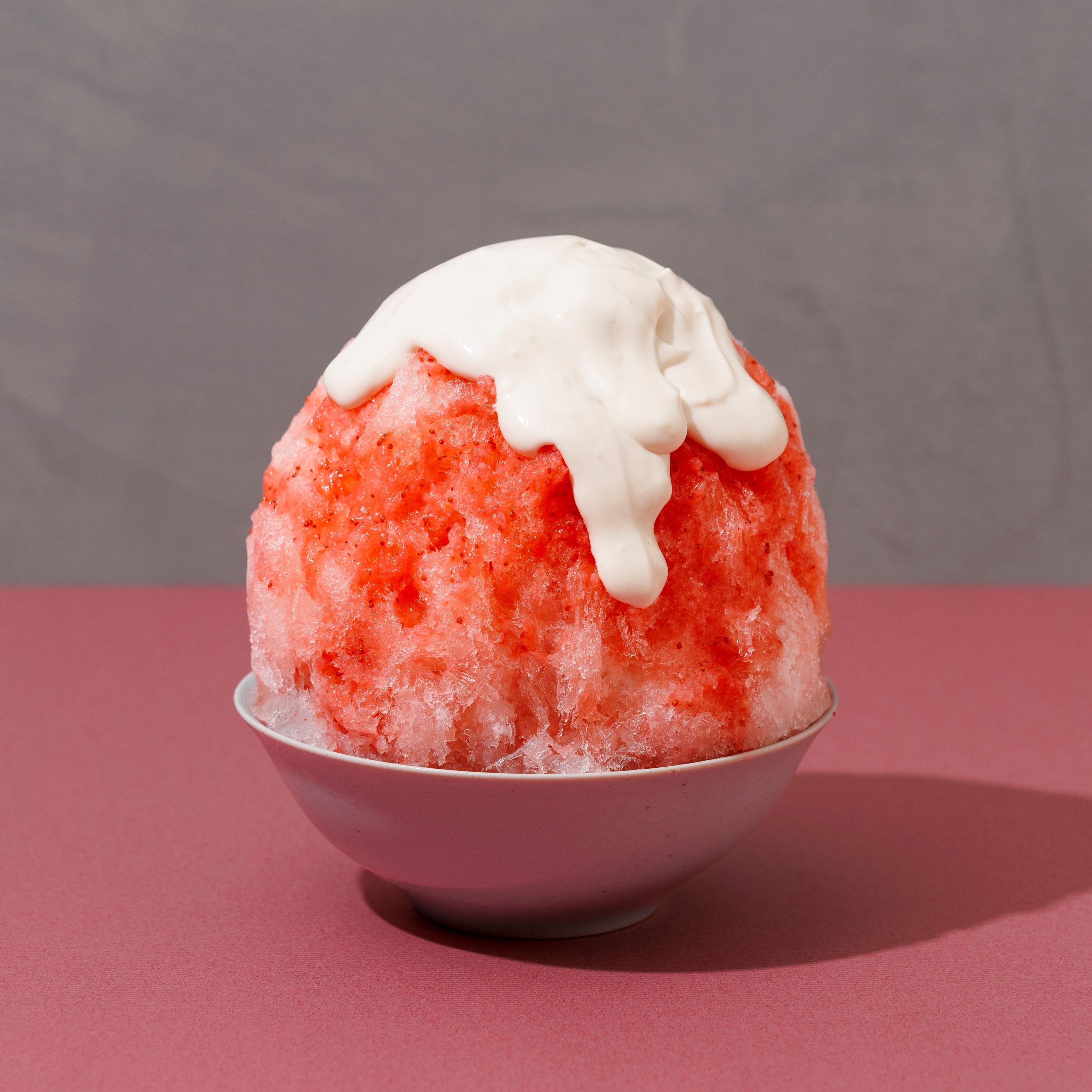 京都・八幡にある「かみむら農園」より届いた日本全体の収穫量のうち、わずか0.002%しか収穫されない有機JAS認定いちごを使用したかき氷。生産農家の上村さんが作ったいちごのぎゅっと濃縮された甘みと、お花のような爽やかな酸味を活かすため、ベースのいちごシロップは、極力加糖をせず仕上げました。てっぺんにトッピングした「豆乳マスカルポーネ」は、いちごとマッチしやすいように豆乳ホイップとあわせて滑らかに。 別添えでお出しするのは、つぶつぶ感を残すため粗目にカットしたいちごと、オレンジ果肉などを加えた「追いいちごソース」。お好きなタイミングでかけていただき、希少ないちごの魅力を存
