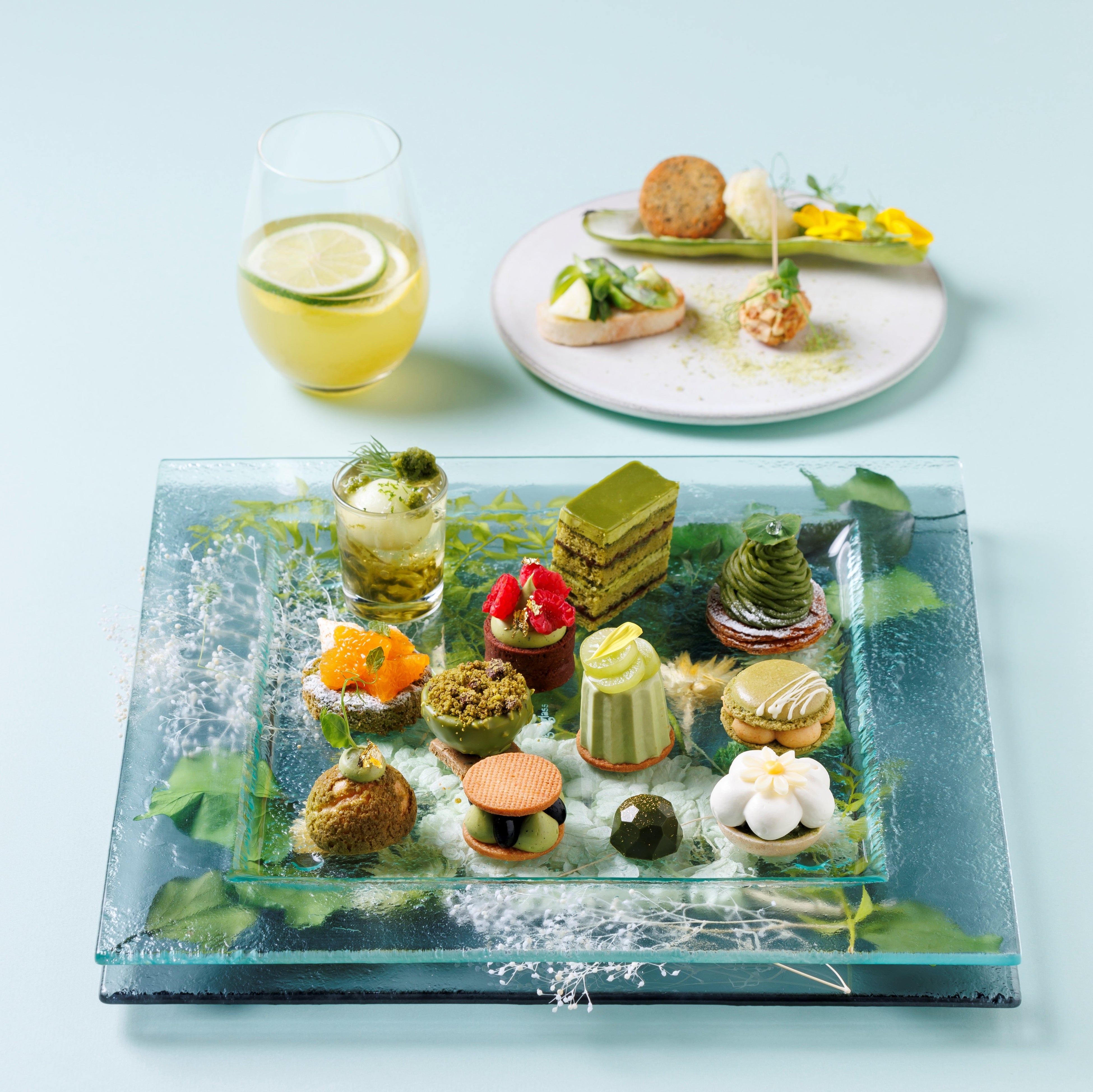 新緑の季節にぴったりな初夏をイメージした抹茶尽くしのアフタヌーンティー。柚子の風味がアクセントとなった「抹茶と柚子のオペラ」をはじめ、 フランボワーズの旨みが抹茶の味を引き立たせる「抹茶とフランボワーズのタルト」や 「抹茶きなこマカロン」、「抹茶と玄米茶のムース」などパティシェのこだわりが詰まった抹茶尽くしのスイーツを計 12 種類ご用意しました。セイボリーでは、有機味噌を使用した「ナッツ味噌クリームチーズボール」や初夏を感じさせる「空豆フリットと豆コロッケ」など計 3 種類をお楽しみいただけます。スイーツやセイボリーが緑色を基調に統一されており、お皿にあしらった装花たちが季節の装いを更に引き立たせます。