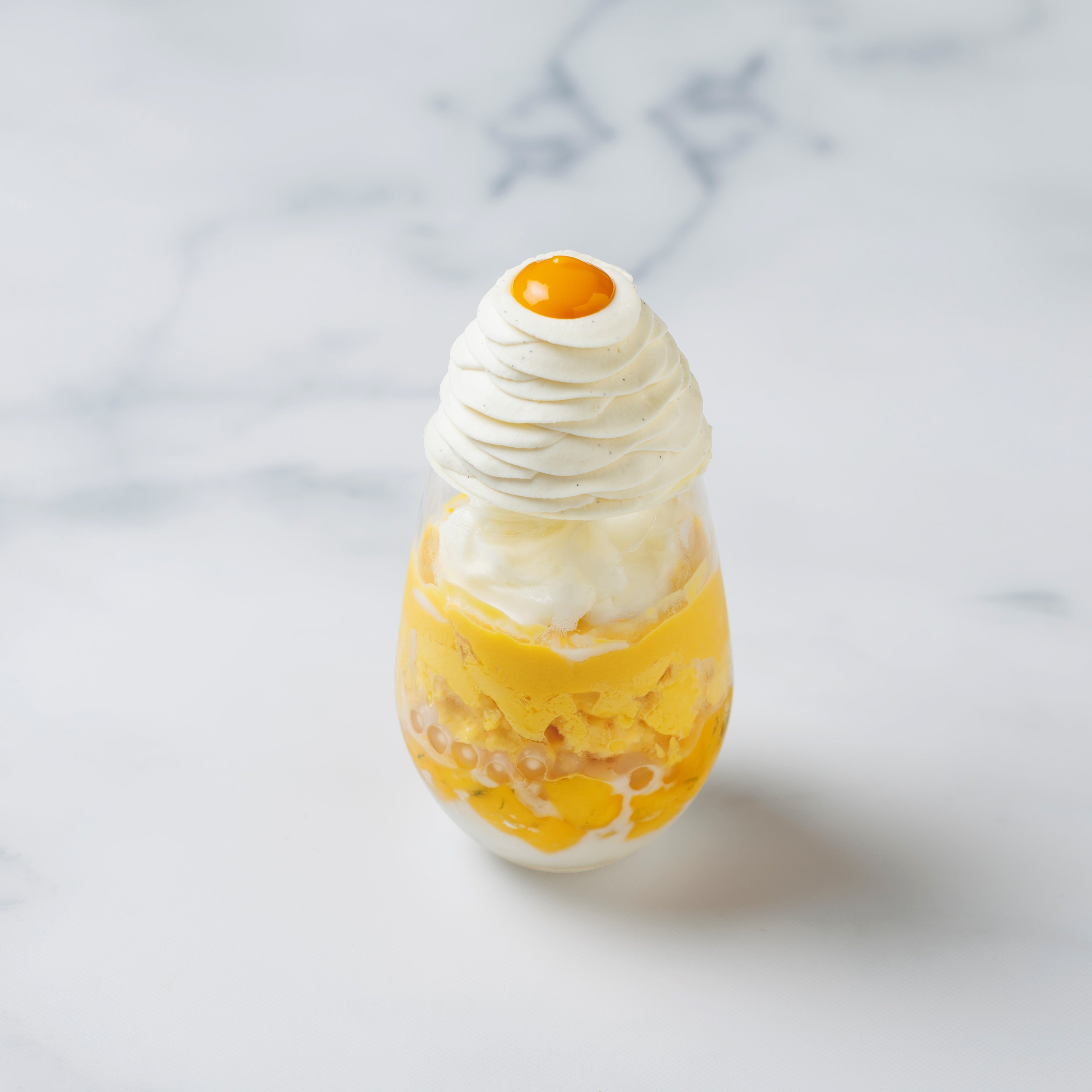 マンゴーの味わいの中に、ライムの爽やかさや、ヨーグルトのグラニテで程よい酸味加え、濃厚さと爽やかさのバランスが絶妙な、さっぱりとした夏にふさわしい仕上がりに。マンゴークリームやライチ風味のタピオカなど、様々な食感を体験できる、楽しい仕掛けが隠れています。