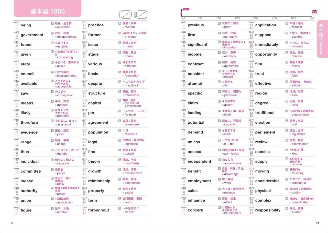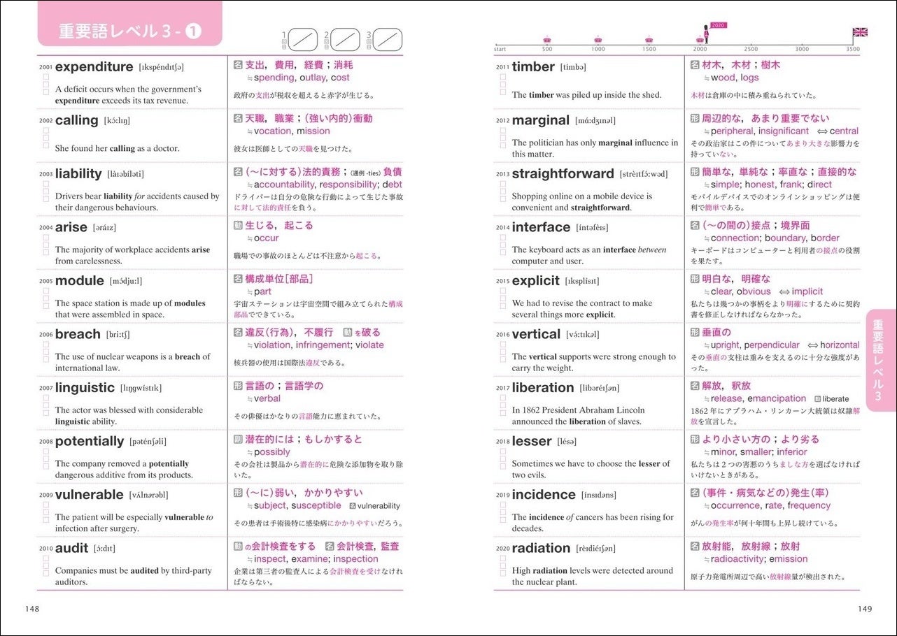 「基本語1000」と「重要語2500」に分かれています。「基本語1000」では、基本語の語義と類義語を確認できます。「重要語2500」は500語ずつレベル1から5に分類されており、語義と発音記号、例文のほか、一緒に覚えれば語彙力を飛躍的に伸ばす類義語や反意語などを掲載しています。
