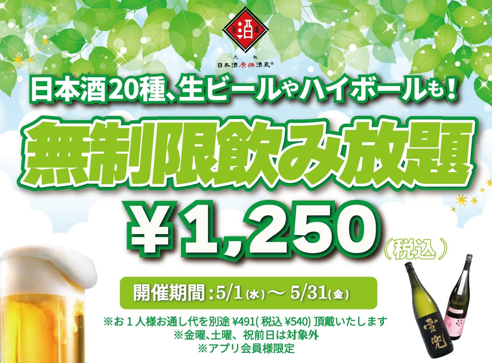時間無制限(最大11時間)日本酒飲み放題¥1,250(税込)|日曜~木曜日、1日30名様限定┃5月1日~31日、日本酒原価酒蔵全店で開催