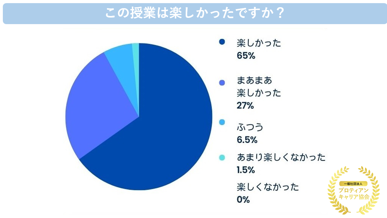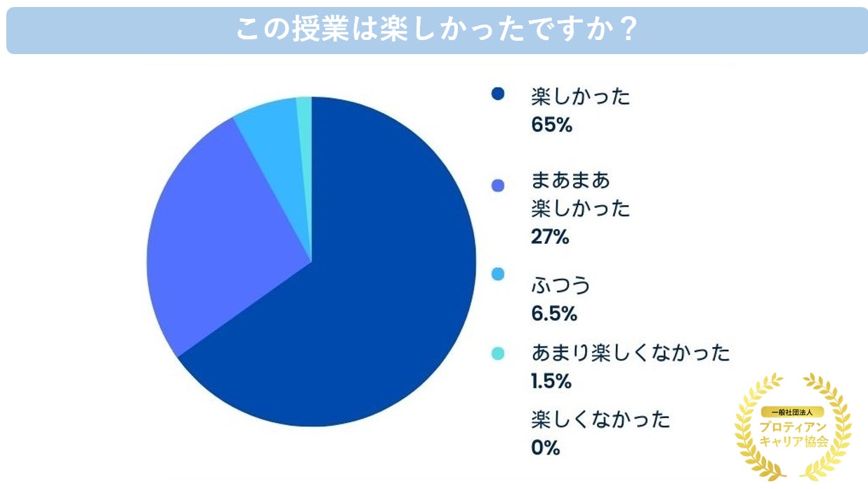 「 楽しかった」「まあまあ楽しかった」と回答した生徒は92%という結果になりました。