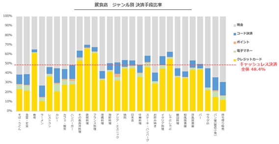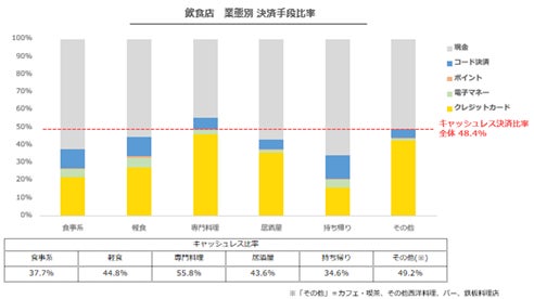集計内容:飲食店 ジャンル別 キャッシュレス決済方法比率、キャッシュレス決済比率(内訳)