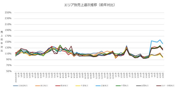 l4月売上、前年対比の伸長率(地方平均)は123.5%と前月から増加した。各地域の売り上げについては、東北地方・中部地方・四国地方以外の地域で前年対比120%を上回る。
