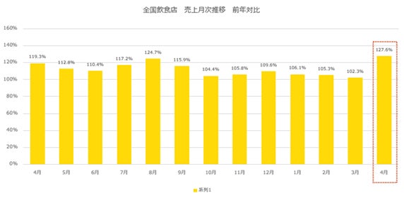 4月度の売り上げ伸長率は、前月から25.3pt増加し、4か月ぶりに上昇した。売り上げは前年対比127.6%で、プラスを維持した。