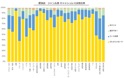 中でも鉄板料理は70.3%と高い水準となった。サラダ店のコード決済比率は20.3%と、最も高い。
