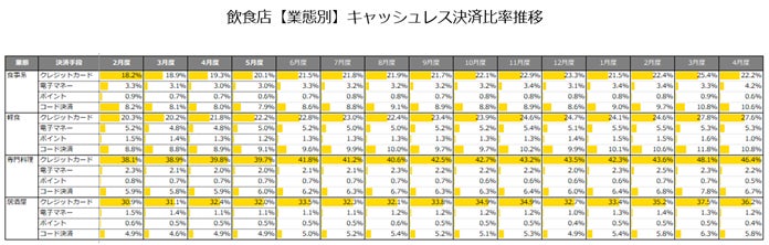 ・キャッシュレス決済手段別では、3月度から4月度で比較すると、食事系の電子マネーの割合を除き、すべての業態で減少した。