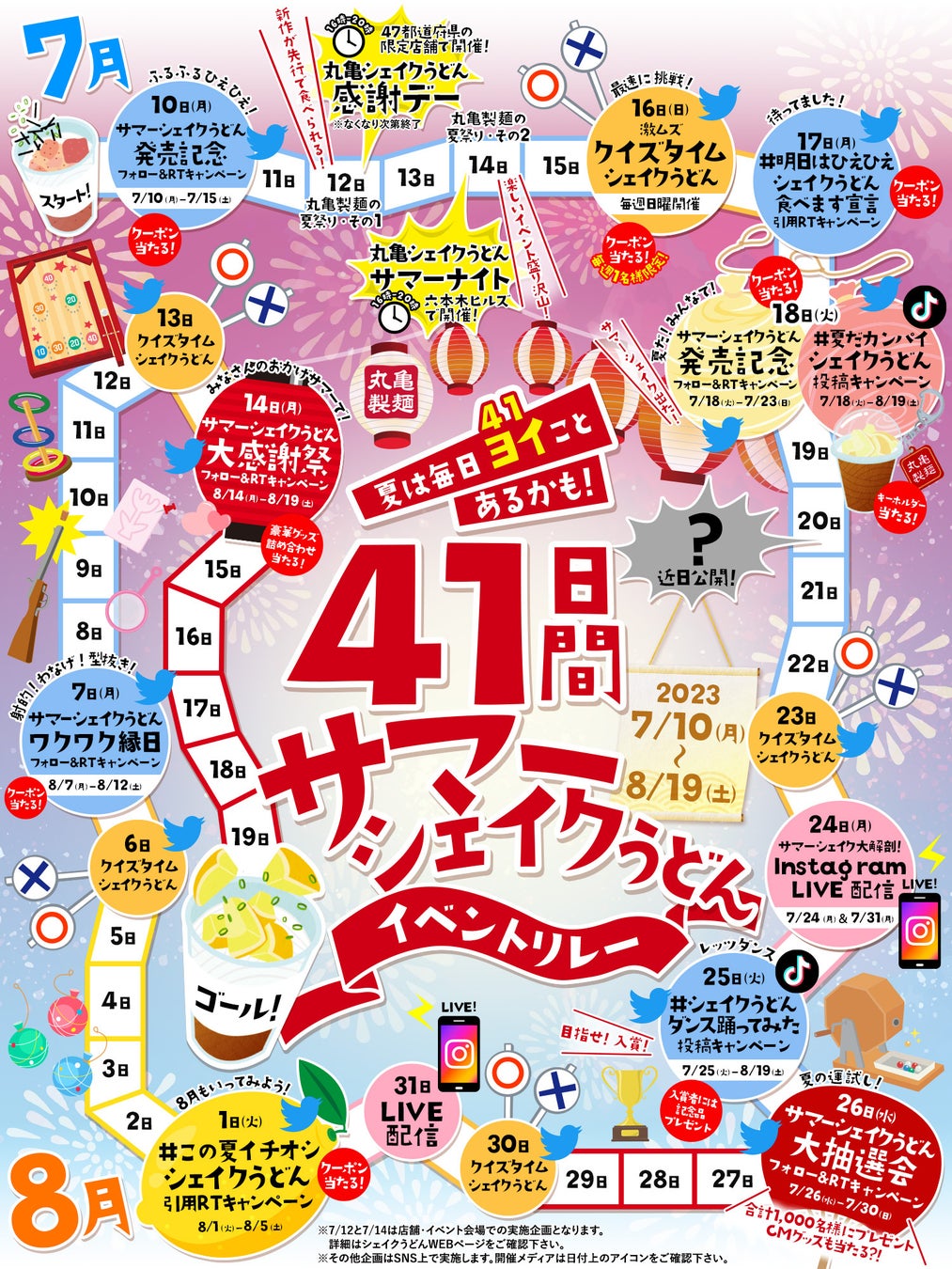 「サマーシェイクうどん」の発売を記念して、7月10日(月)から8月19日(土)までの41日間毎日連続でイベント、キャンペーンを実施します。