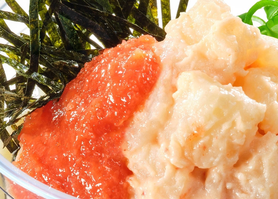 冷たい明太クリームだしに、明太ポテトサラダ、さらに明太子と刻みのりを添えたクリーミーかつピリリとした味わい。
