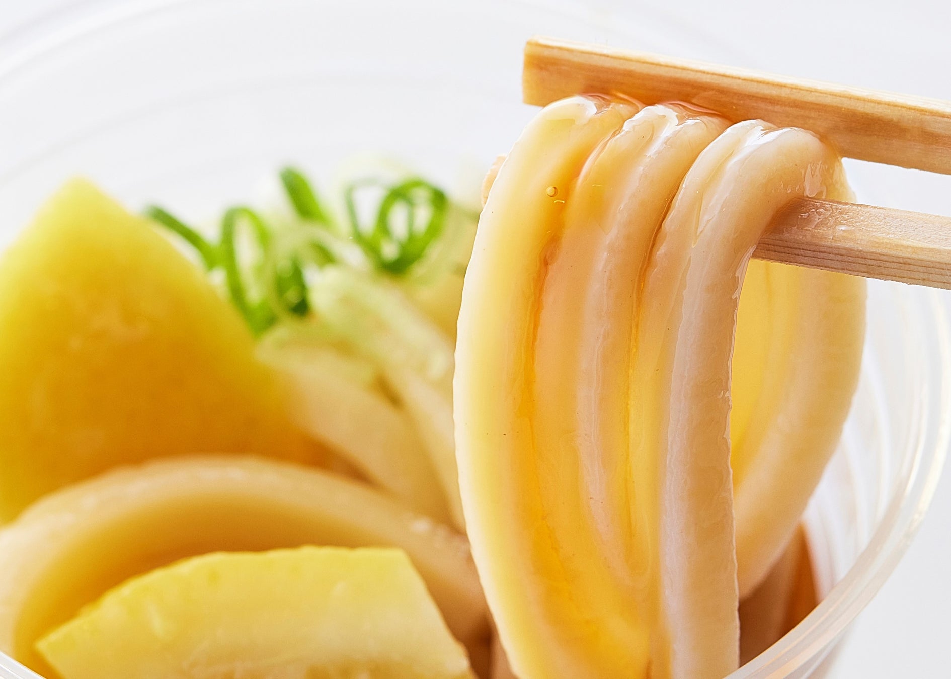 「丸亀シェイクうどん」も、ご注文をいただいてから水できゅっと締めたコシのある麺と特製だし、具材を一つひとつカップに入れてご提供いたします。国内800を超えるすべての店で毎日、100%国産小麦、塩、水のみでつくる打ち立て、茹でたてのうどんだからこそテイクアウトでも、もちもちの「丸亀食感」を楽しんでいただけます。水できゅっと締めることで、滑らかな口あたりでのどごしの良いうどんになり、噛んだ瞬間にもちっと心地よいコシを味わっていただけます。