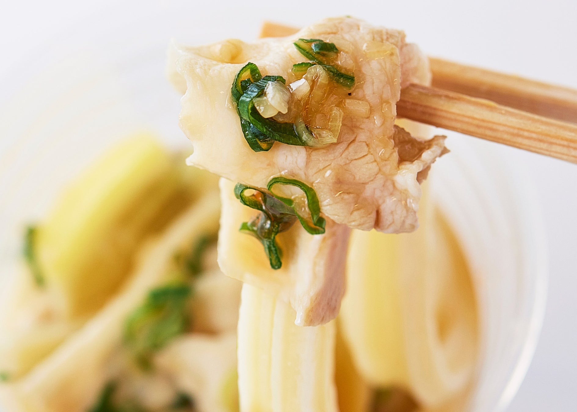 毎日800を超える店で、職人が打つコシのあるうどんは、豚しゃぶのガツンとした味わいにも負けることなく、しっかりと麺本来のおいしさやのどごしをご堪能いただけます。爽やかな酸味とだしの効いた特製レモンぶっかけだしとねぎ塩だれをつるっとしたのどごし抜群のうどんに絡めて、豚しゃぶと一緒に豪快にお召し上がりください。