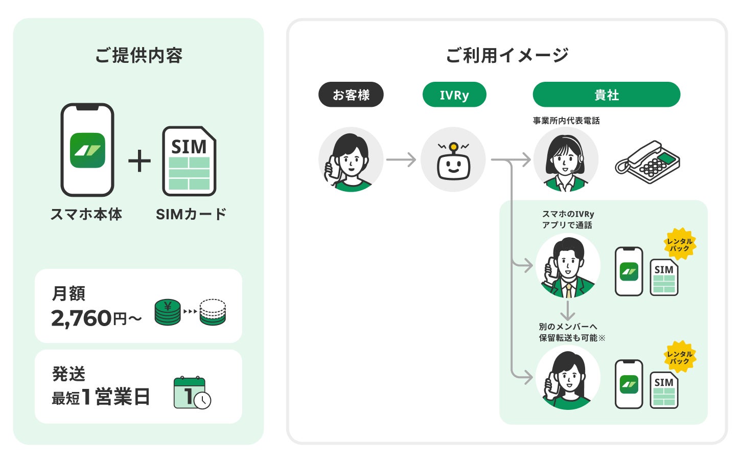 「IVRy スマホレンタルパック」は、IVRyユーザーを対象に当社がスマートフォンとSIMカードを貸し出し、固定電話などへの入電をスマートフォンで受信できるようにする月額制のサービスです。