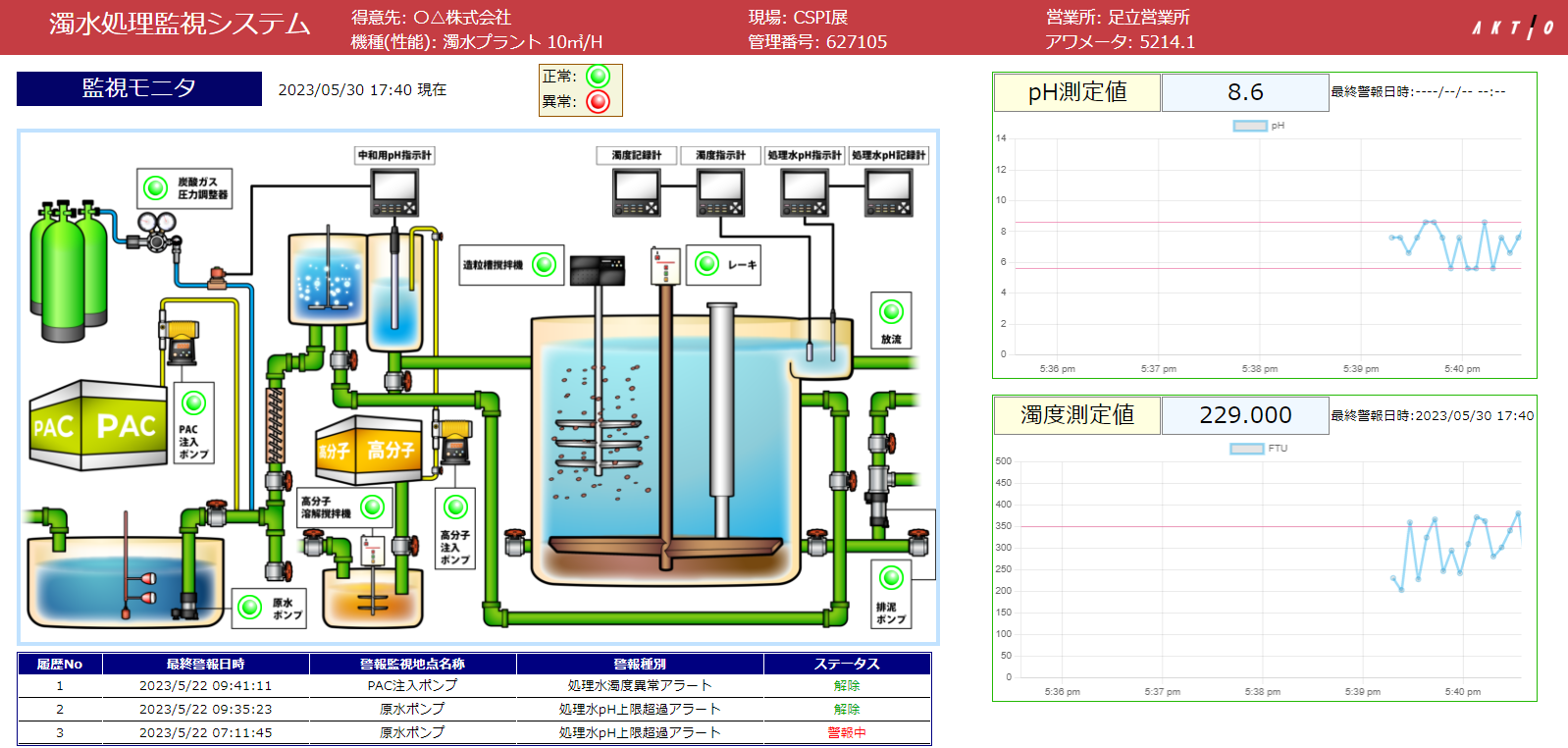 今回の「遠隔監視システム搭載濁水処理装置」は、薬品の残量やpH・濁度の記録や流量などのデータをクラウド上で一括管理することができ、遠方からでも機械状況を確認することが可能になりました。また、異常な数値が発生した場合はメール等で担当者へ通知する機能も備えています。