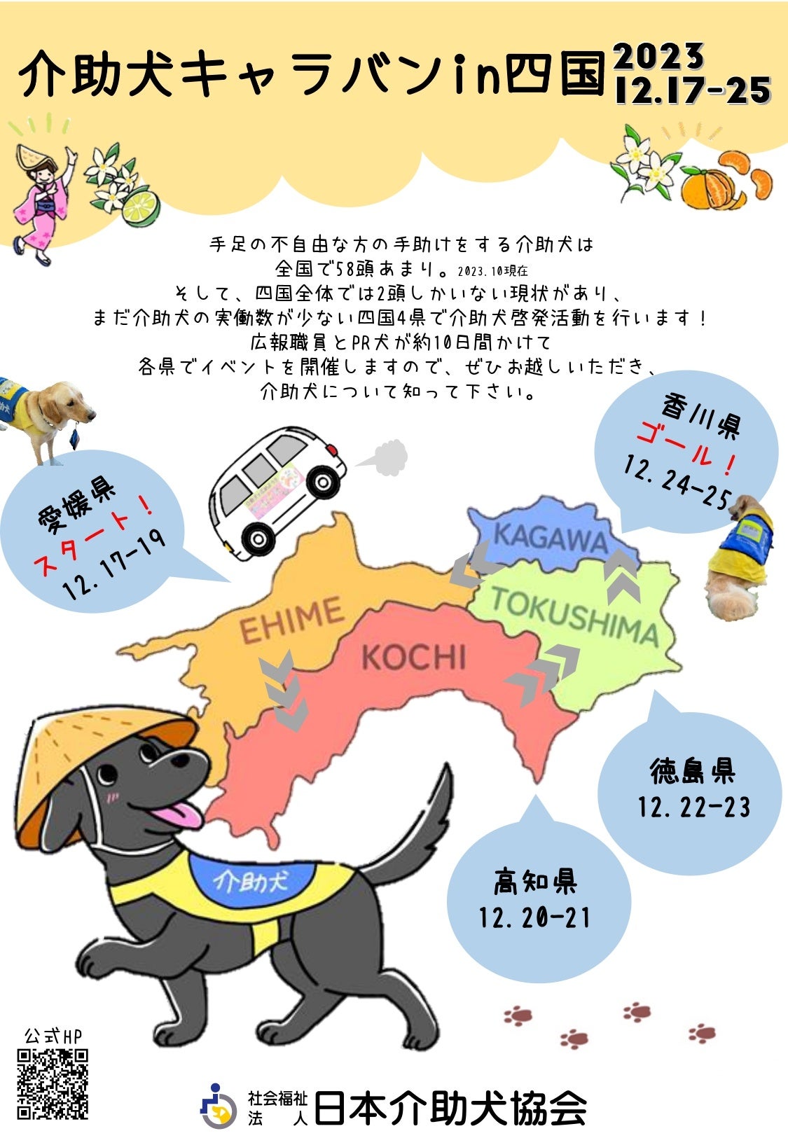 協会は介助犬の実働数が少ない地域に特化して啓発活動を行う「介助犬キャラバン」を昨年より実施している。第一回目の東北地域に続き、今回は12月17日(日)~25日(月)で第二回目として四国4県での啓発活動を企画した。