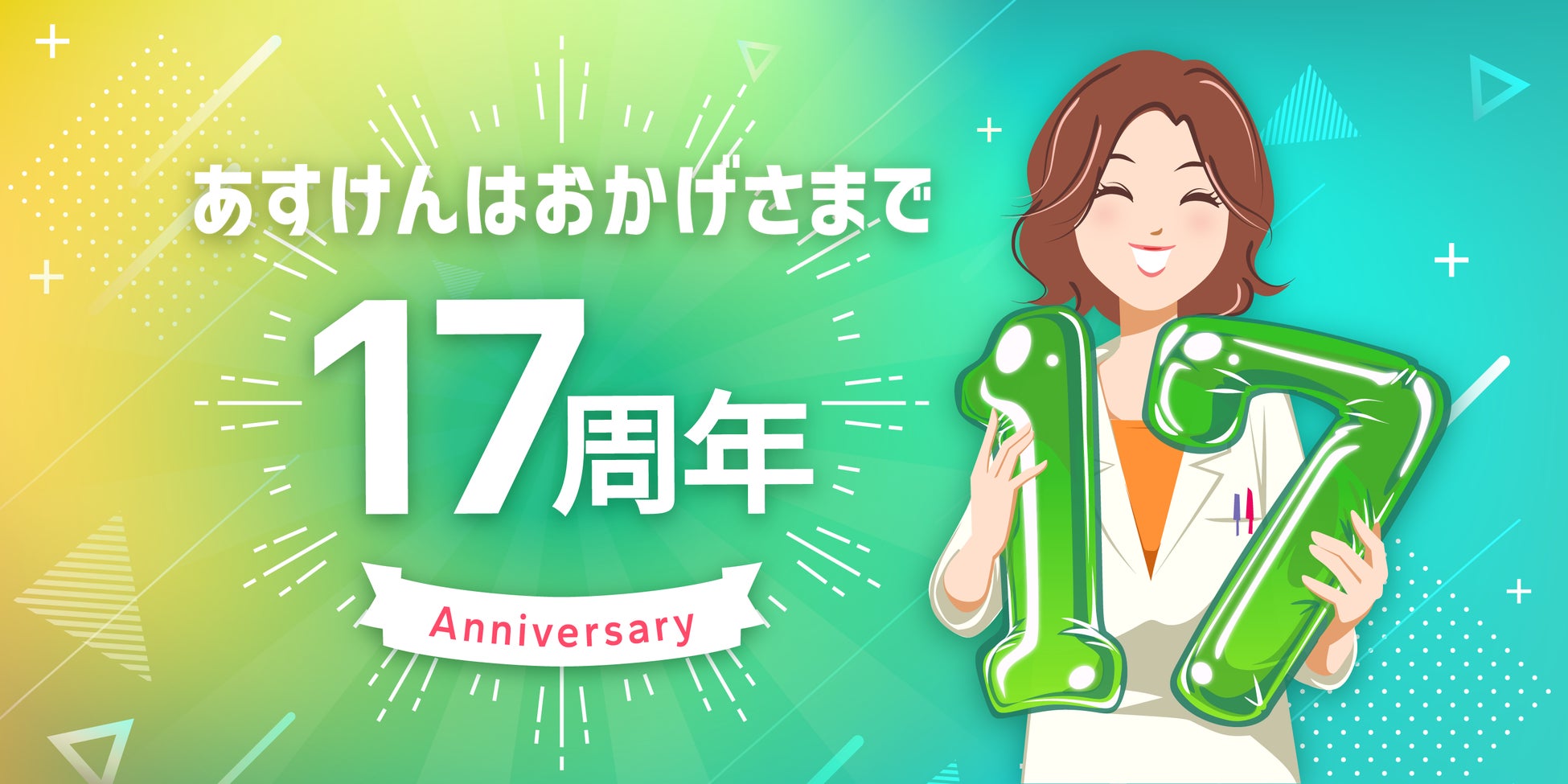 『あすけん』アプリ起動時に、「17」の数字のバルーンを手に持ったAI栄養士キャラクター・未来さんが期間限定で登場します!特別仕様の未来さんを、ぜひアプリでご確認ください。